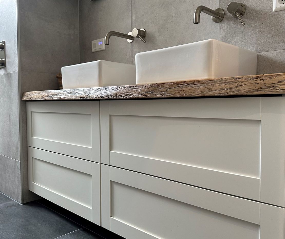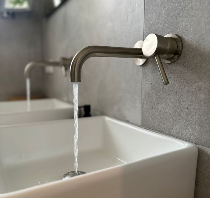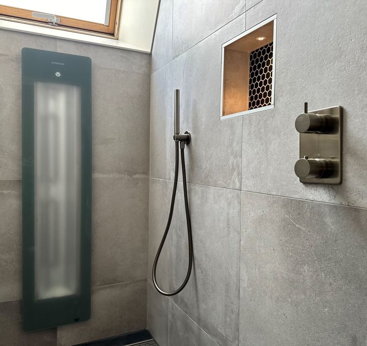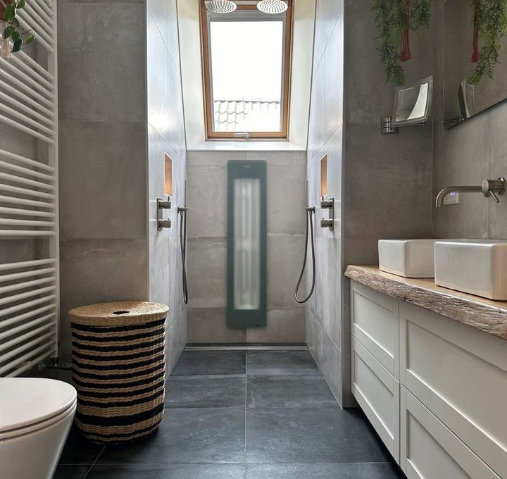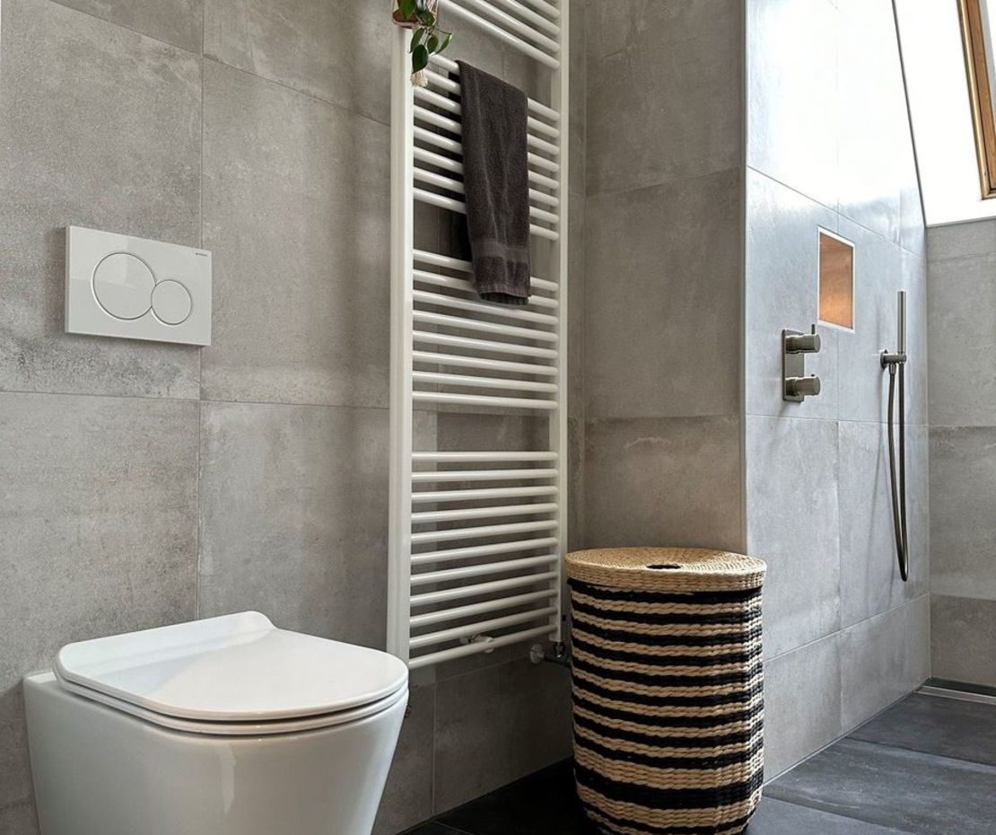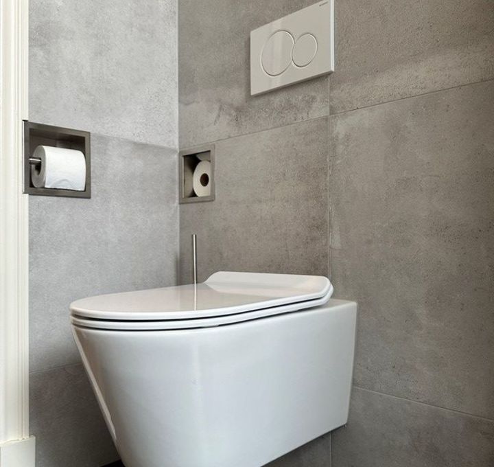 Deze compacte badkamer is geleverd in Joure, uitgevoerd in een moderne stijl met betonlook tegels. De kranen en accessoires zijn gemaakt van geborsteld staal, wat zorgt voor een strakke en industriële uitstraling. Deze combinatie van materialen creëert een tijdloze en minimalistische sfeer, ideaal voor een kleine maar stijlvolle badkamer.