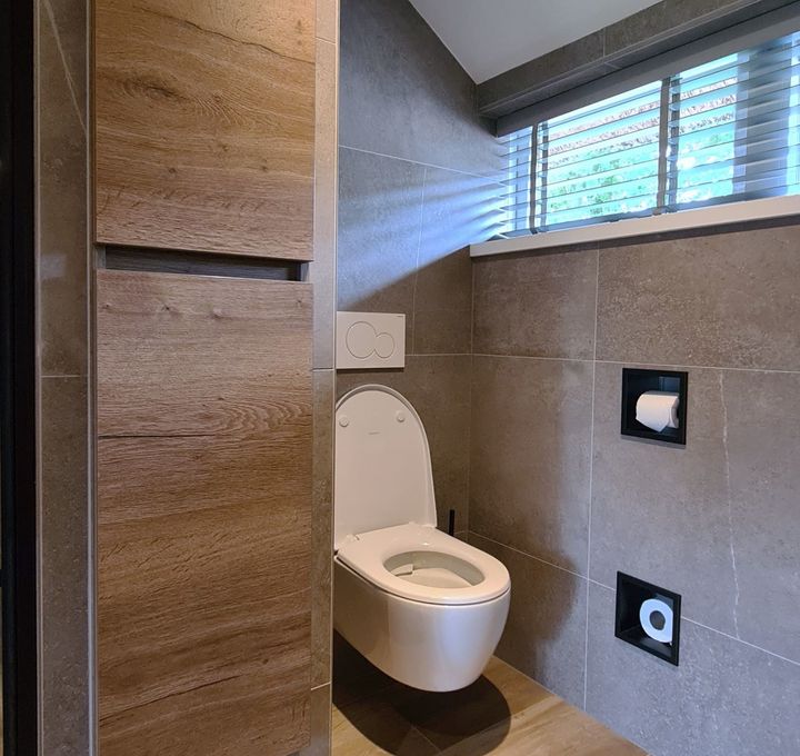 De ruimte is slim ingedeeld, met een hoge kast ingebouwd in de muur. Deze kast vormt de scheiding tussen het toilet en de douchehoek, waardoor de badkamer een open en georganiseerde uitstraling krijgt. De douche zelf heeft een strakke mat zwarte deur, wat een stoer contrast vormt met de rest van de badkamer.