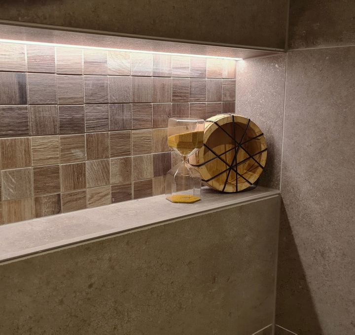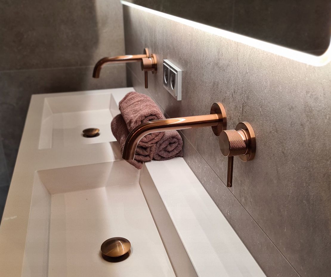 Stel je een badkamer voor die zowel stijlvol als praktisch is. Het middelpunt is een 140 cm breed badmeubel in de warme kleur Tabacco. Dit meubel heeft twee wastafels, perfect voor als je samen met iemand anders de badkamer gebruikt. De ingebouwde kranen boven de wastafels zijn van geborsteld koper en hebben een prachtig carving-detail, wat een luxe uitstraling geeft.