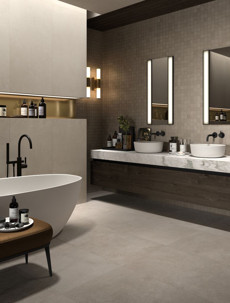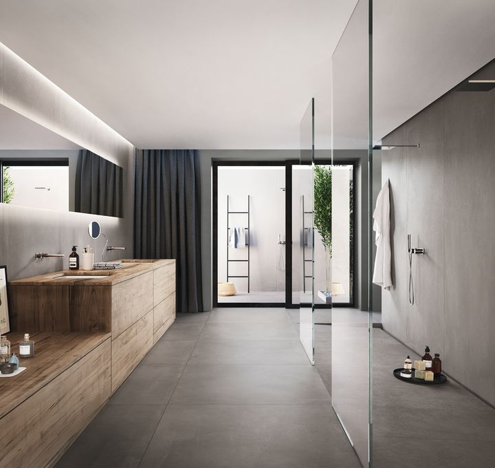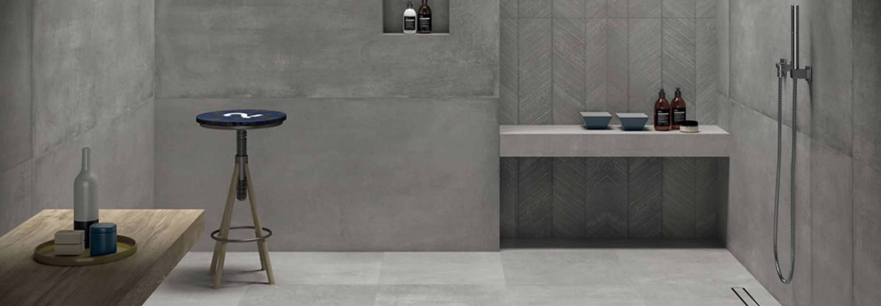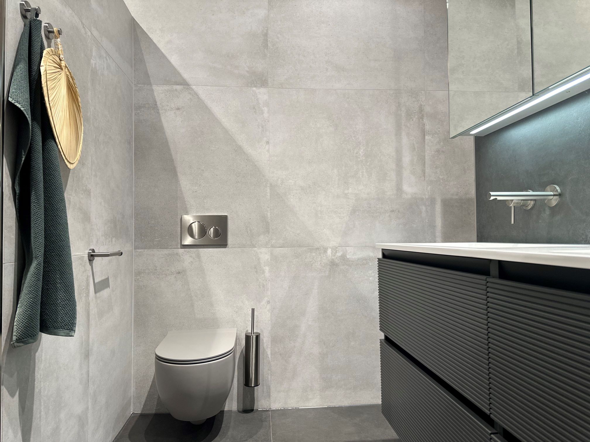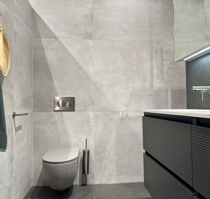 Kenmerken van een betonlook badkamer zijn onder andere de ruwe, maar stijlvolle afwerking. Je ziet vaak grootformaat tegels (ook wel slabs genoemd) met vlakke oppervlakken. De badkamer ziet er dankzij deze grootformaat tegels vaak uit alsof hij uit één stuk bestaat. Dit draagt bij aan een rustige, uniforme uitstraling.