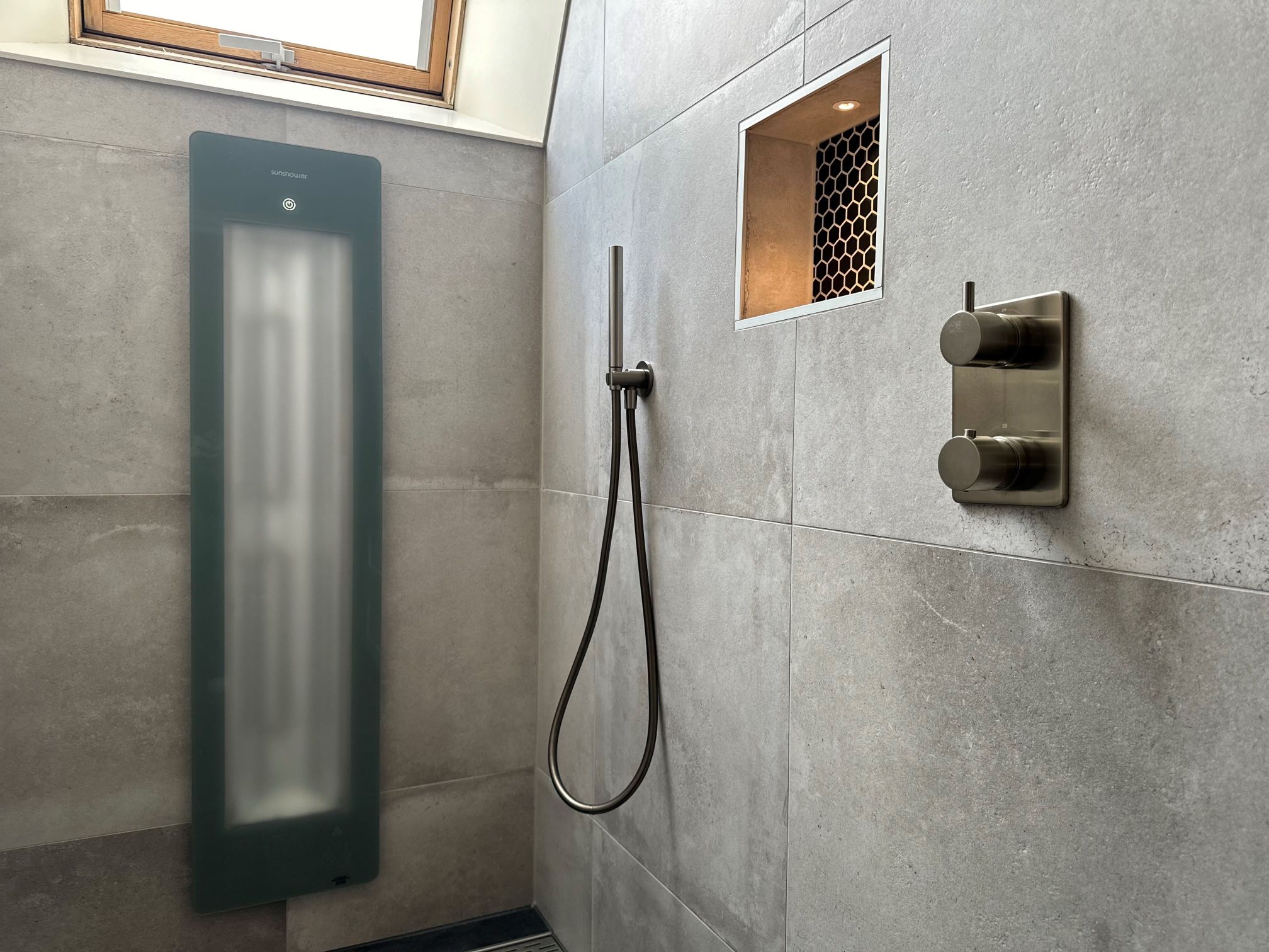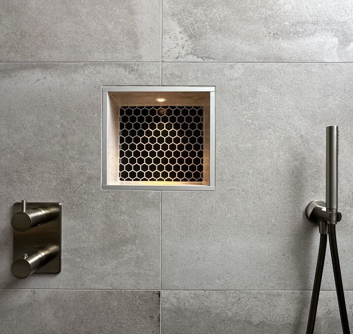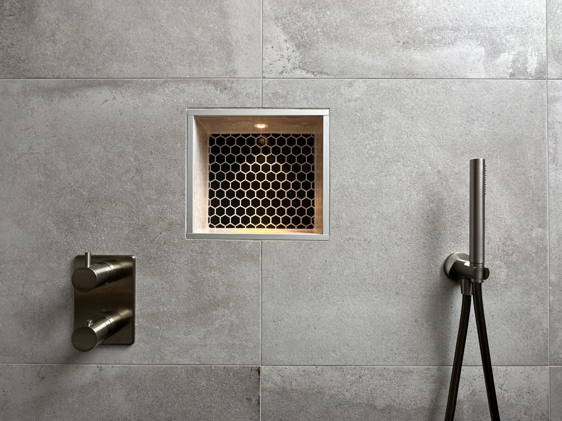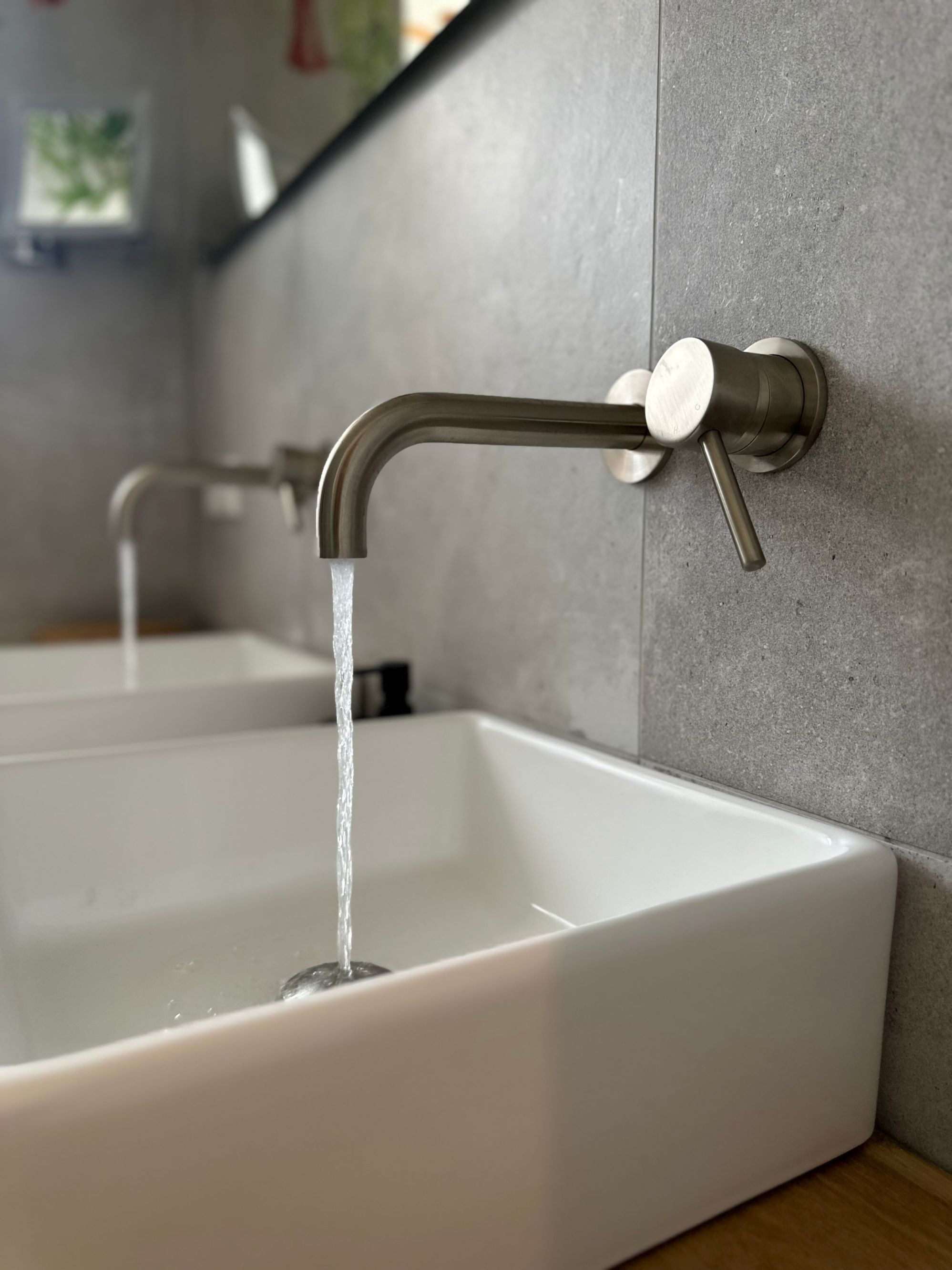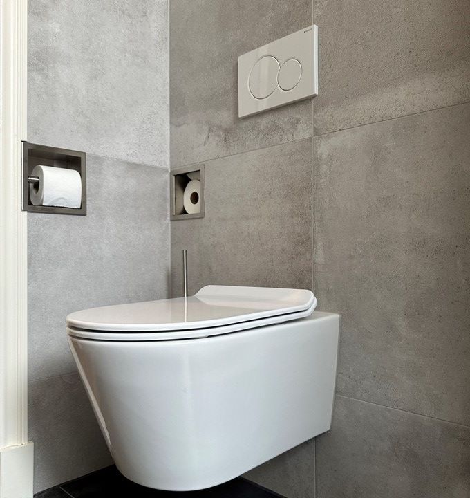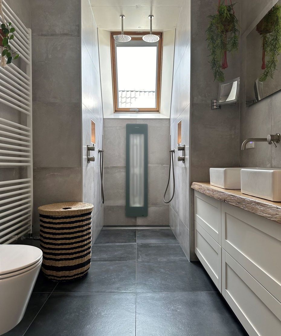Deze compacte badkamer is geleverd in Joure, uitgevoerd in een moderne stijl met betonlook tegels. De kranen en accessoires zijn gemaakt van geborsteld staal, wat zorgt voor een strakke en industriële uitstraling. Deze combinatie van materialen creëert een tijdloze en minimalistische sfeer, ideaal voor een kleine maar stijlvolle badkamer.