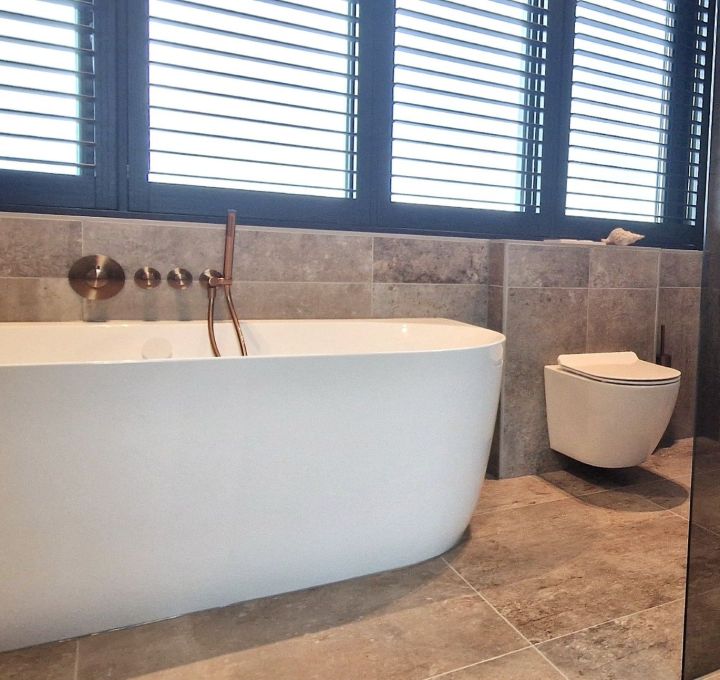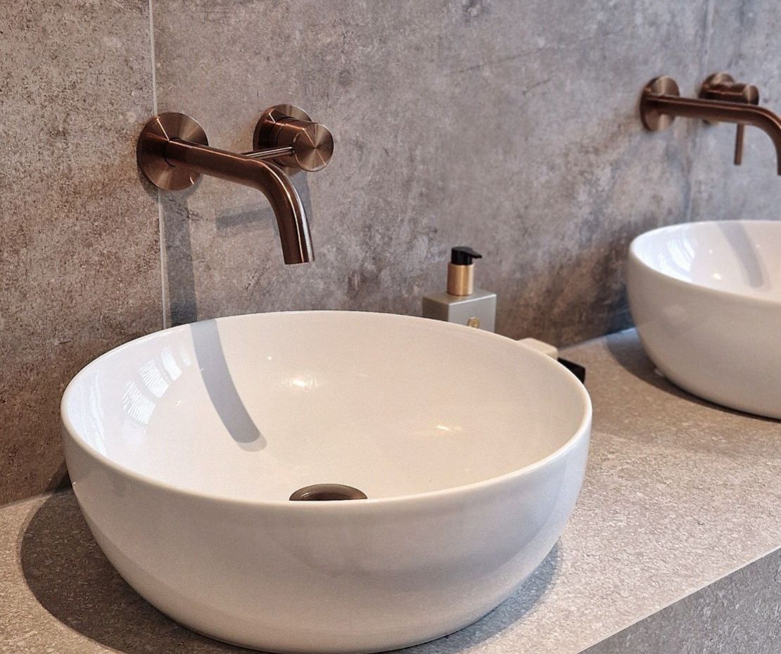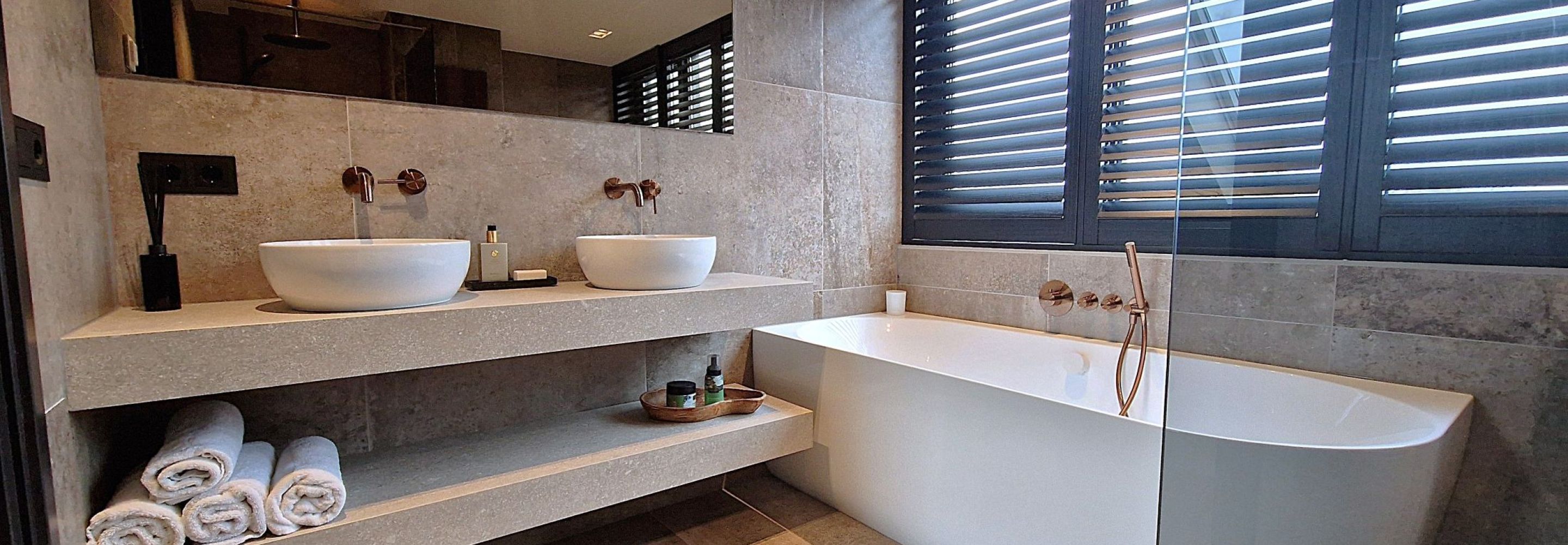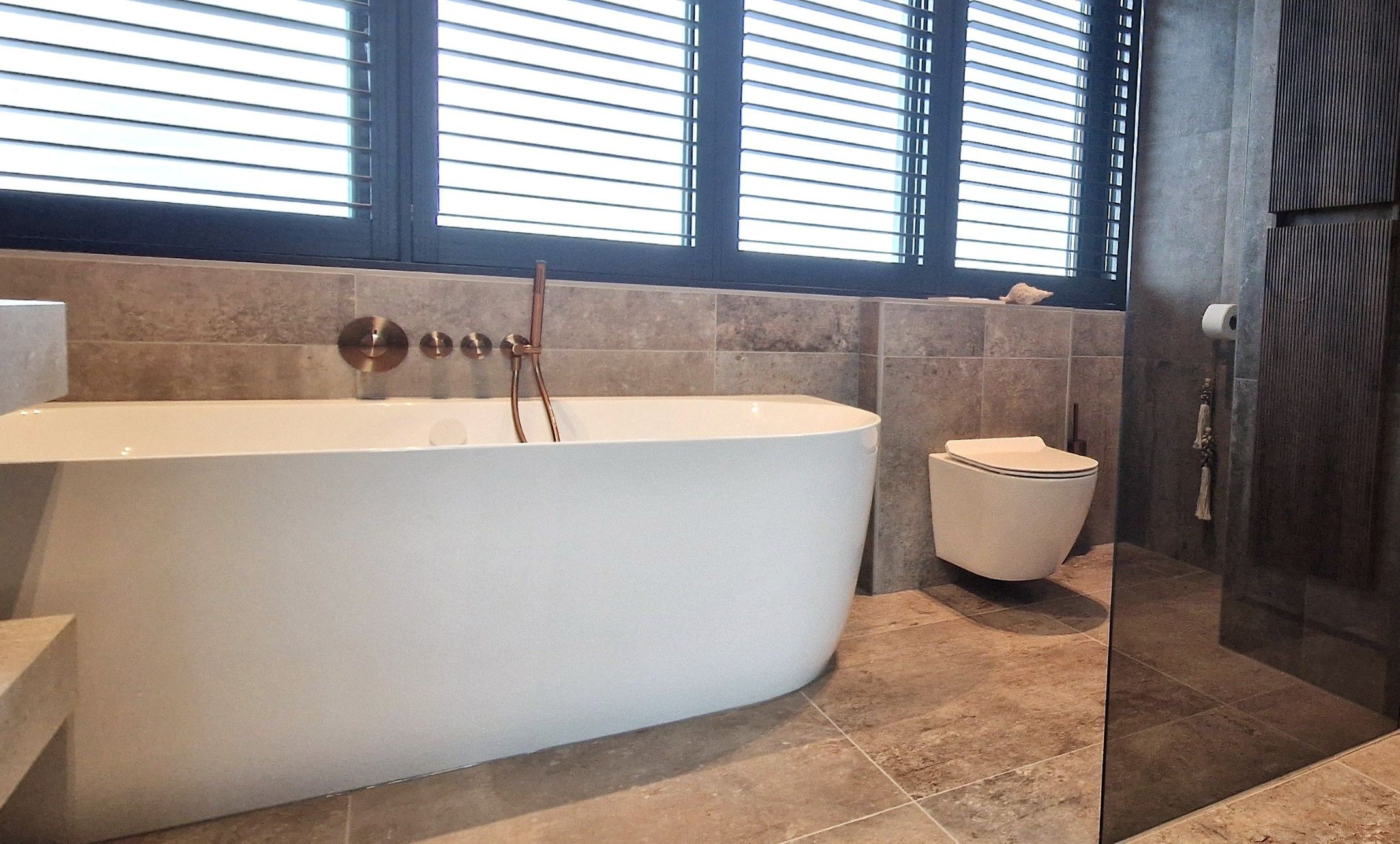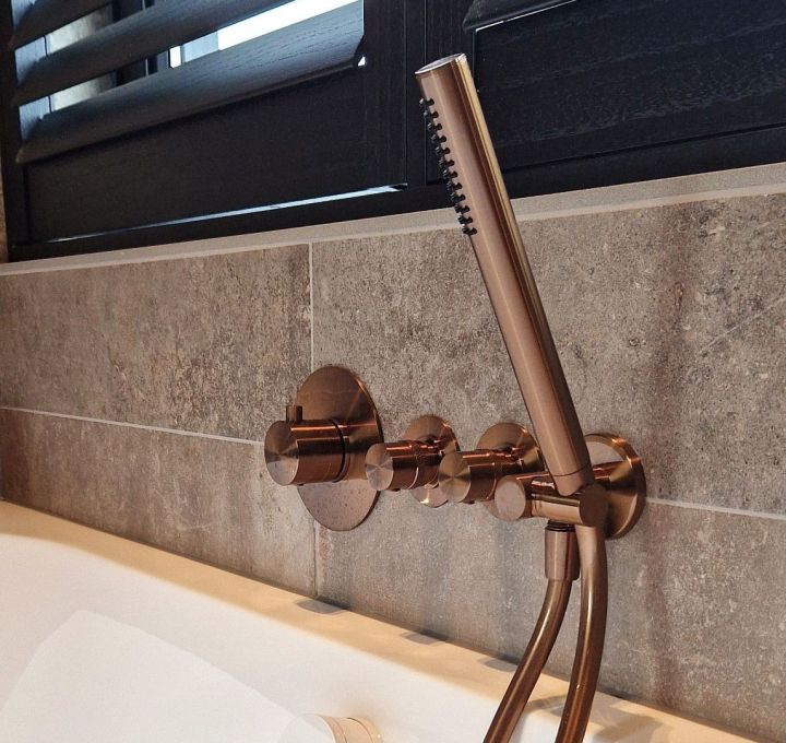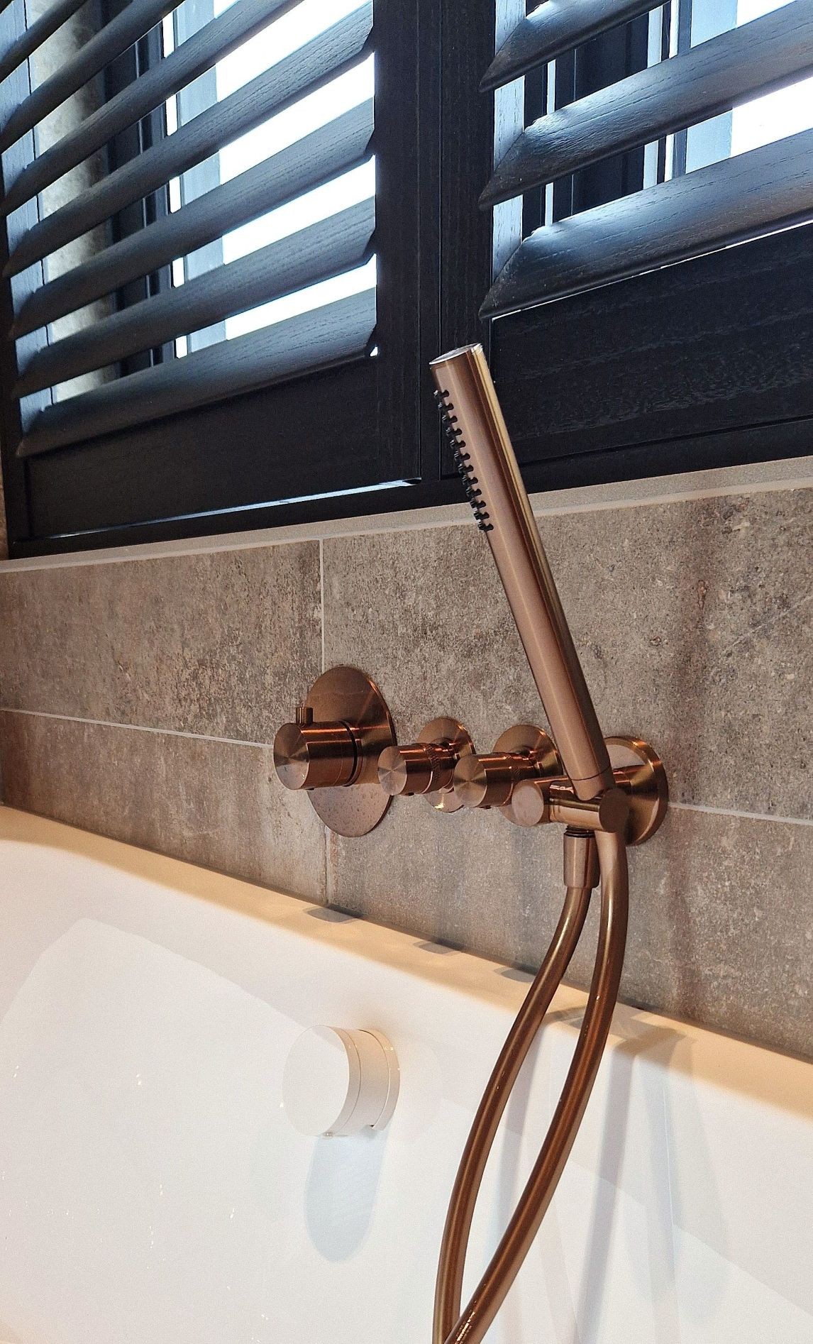 De kranen en clickwastes zijn uitgevoerd in brons en komen subtiel terug in de rest van de ruimte. Naast het meubel staat een halfvrijstaand bad, geplaatst onder de grote raampartij. Dat zorgt voor veel daglicht en een ruimtelijk gevoel. De bronzen inbouwbadkraan maakt het plaatje compleet en sluit naadloos aan bij de rest van het sanitair.