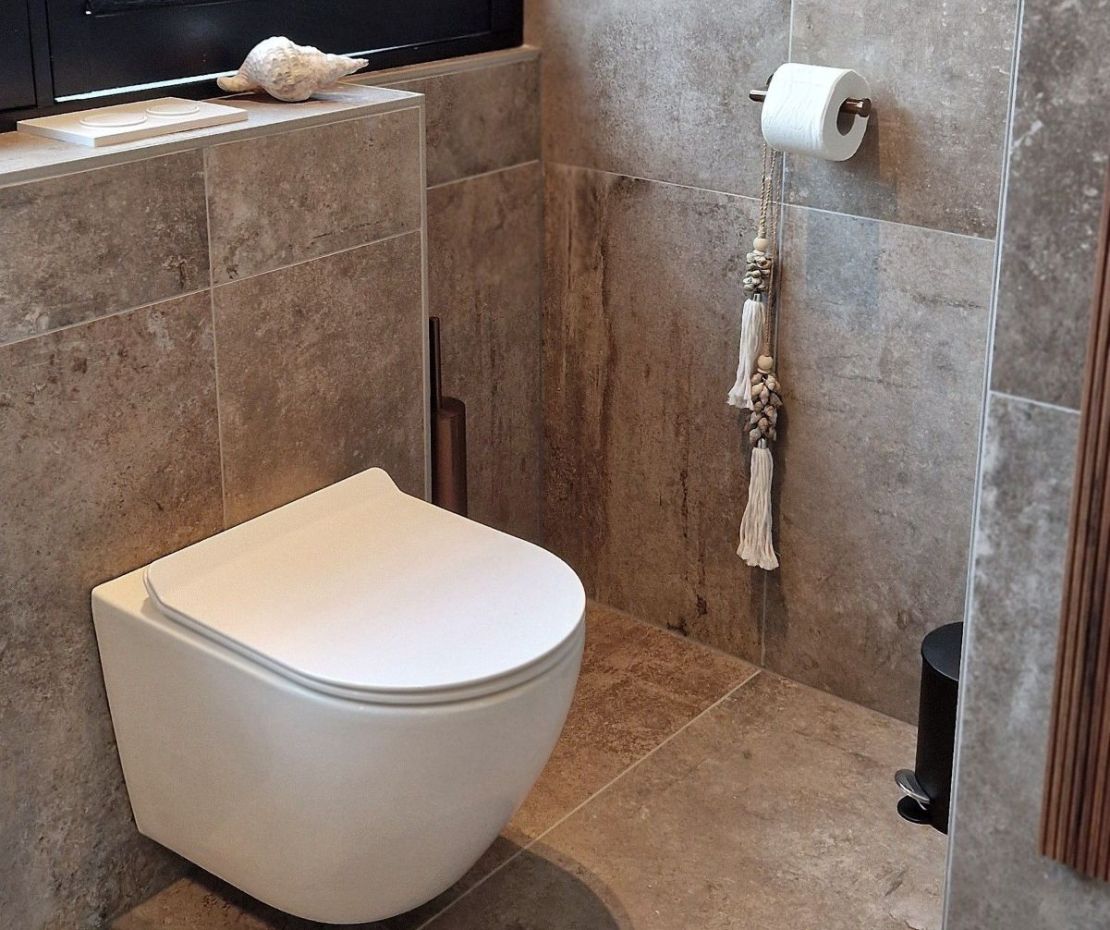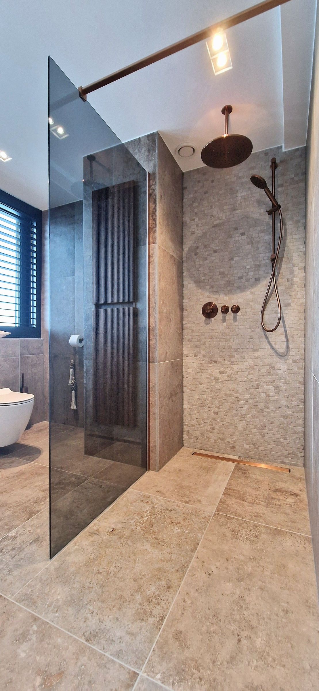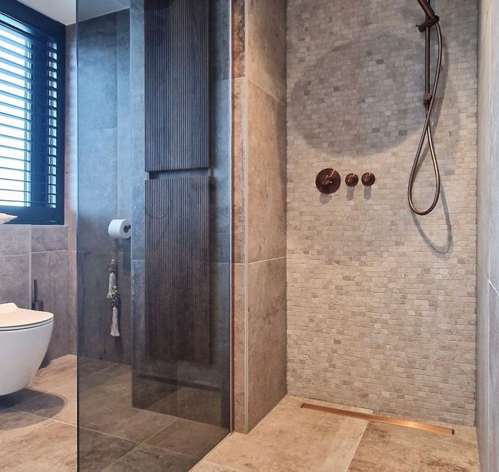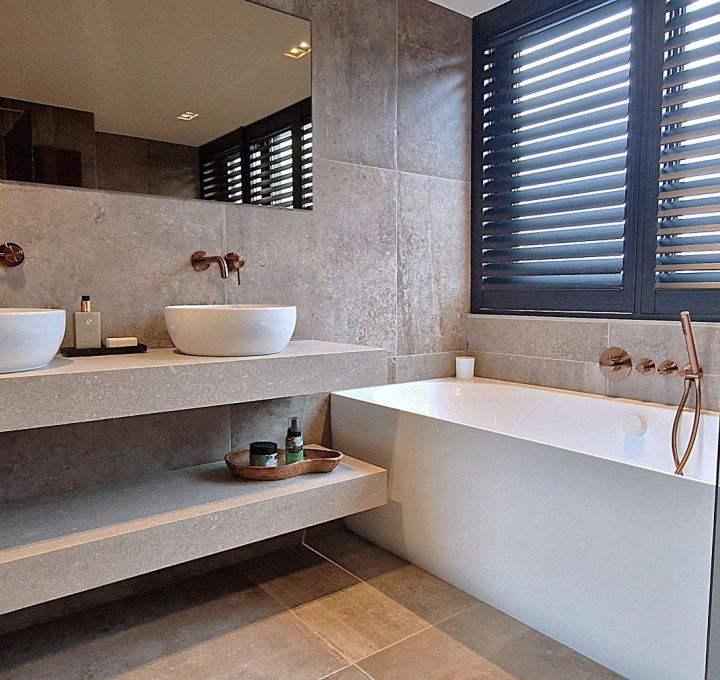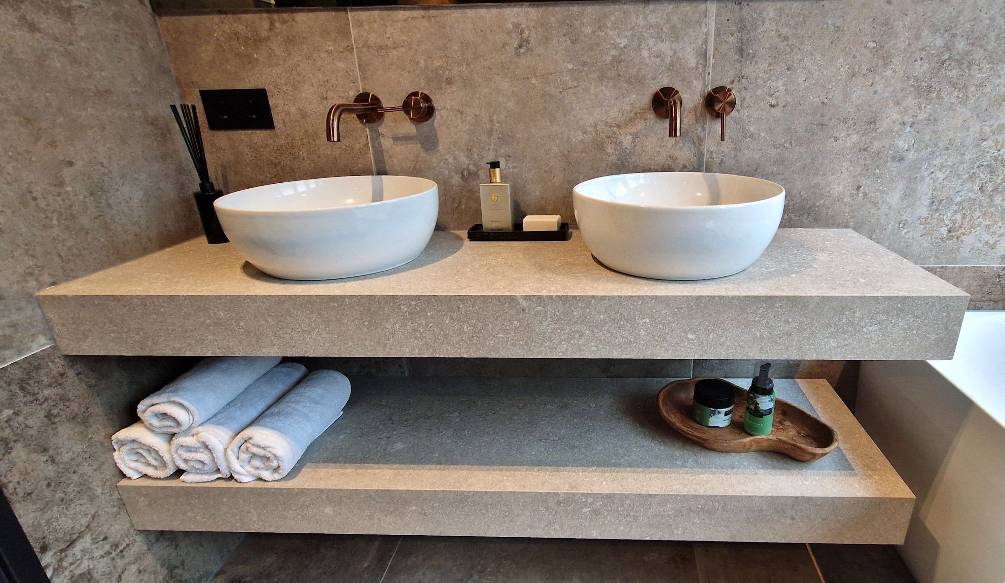 Elegantie en finesse vind je terug in deze badkamer. Het maatwerk meubel van 160cm past hier precies in thuis! Het meubel is opgebouwd uit exact dezelfde tegelserie als de vloer en wanden, waardoor alles één geheel vormt. De twee witte waskommen liggen mooi op het blad en geven een fris contrast met de warme aardetinten van de tegels. Daarboven hangt een spiegel van 160cm met een bronzen omlijsting, perfect in verhouding om het meubel extra kracht te geven.