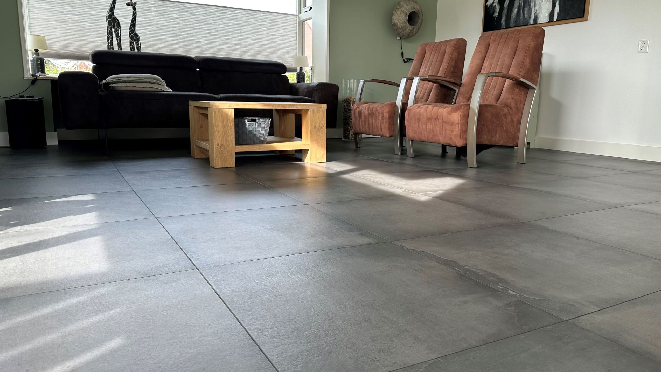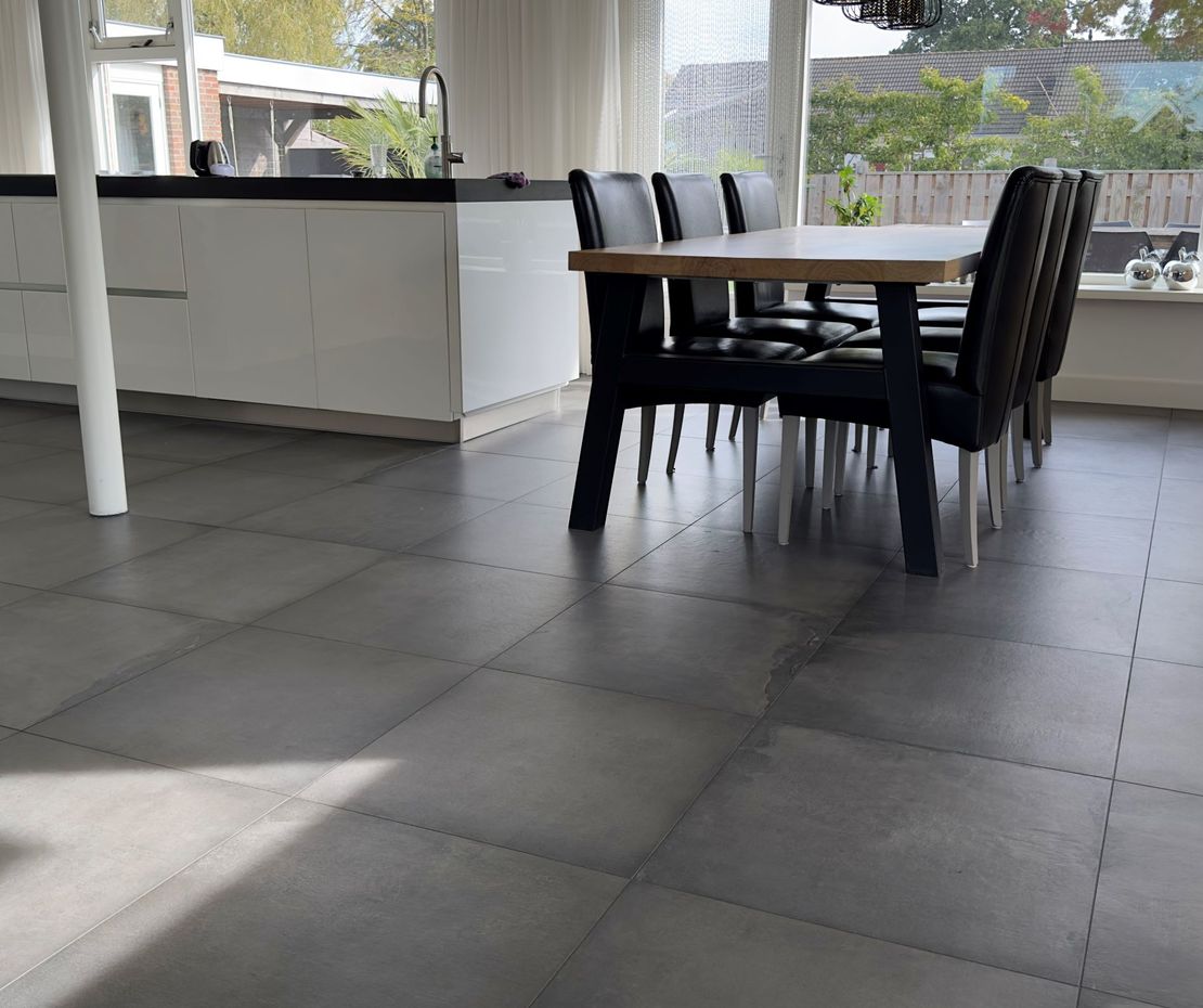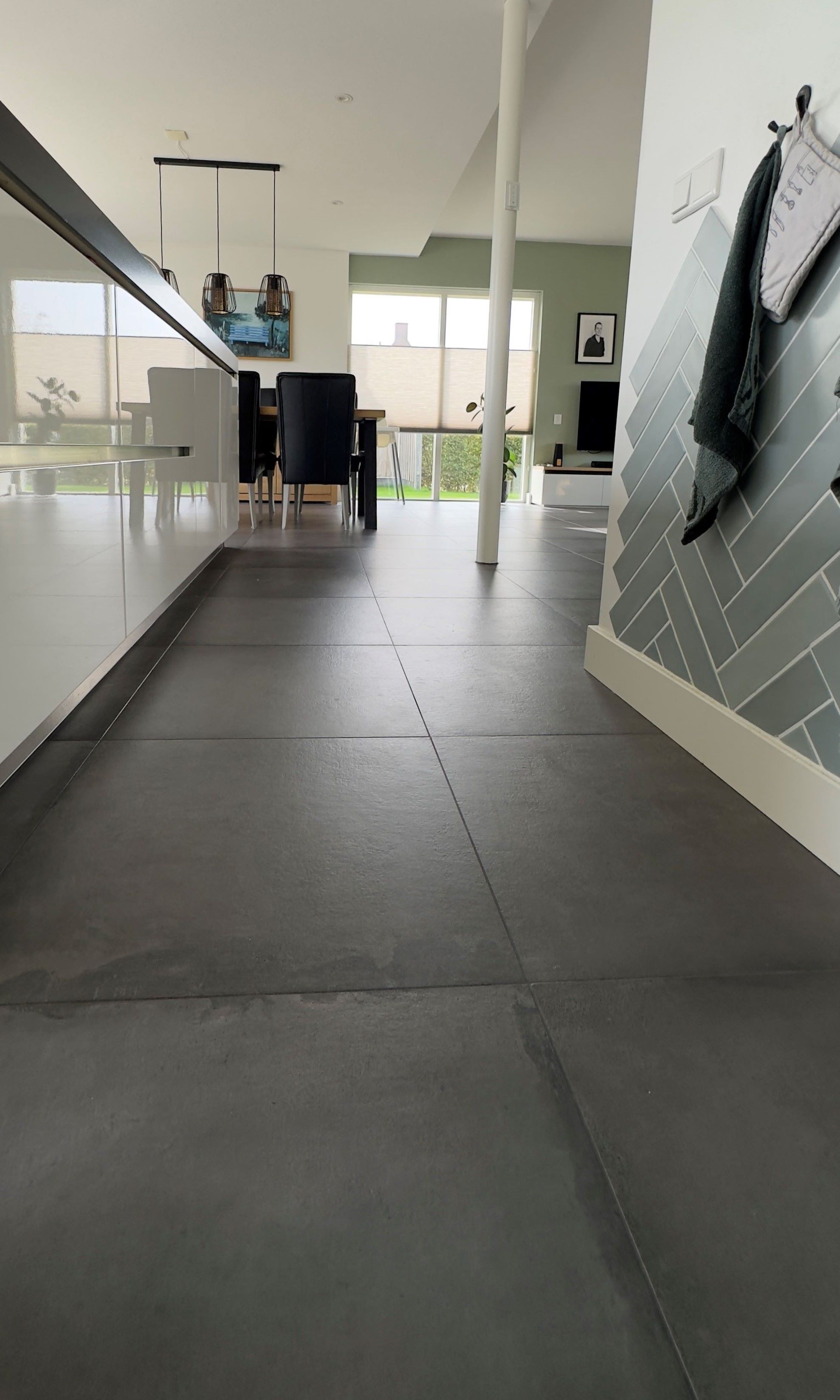De 60x60cm betonlook tegelvloer in een stoere zwart/donkergrijze tint is een echte blikvanger in dit huis! De vloer is gelegd in de woonkamer, keuken en hal, waardoor er een mooi doorlopend effect ontstaat dat de ruimtes op een rustige manier met elkaar verbindt. De rustige betonlook geeft hier een strakke en tijdloze uitstraling.