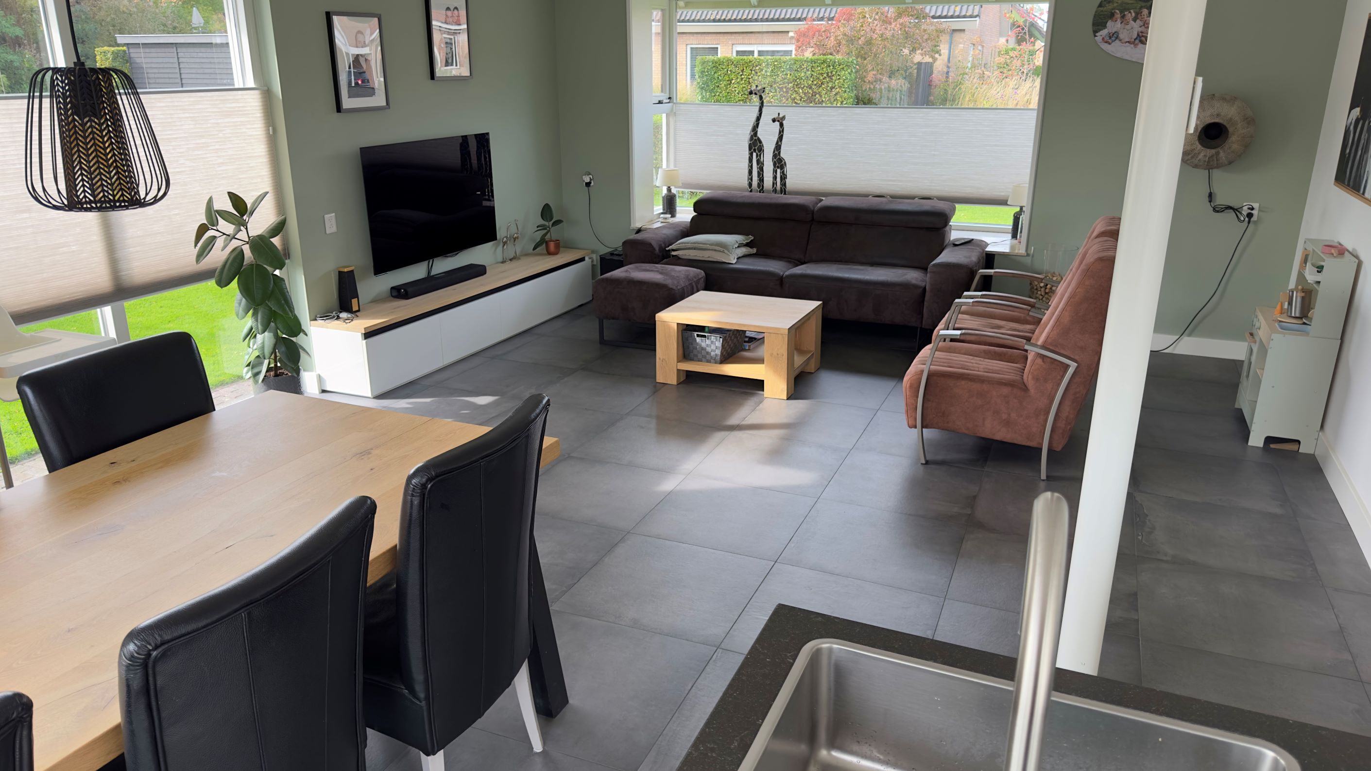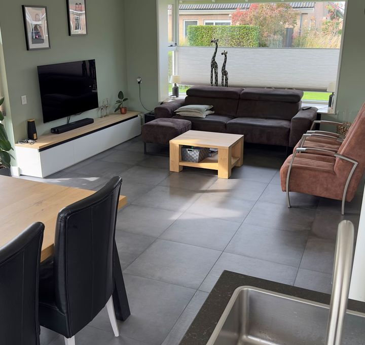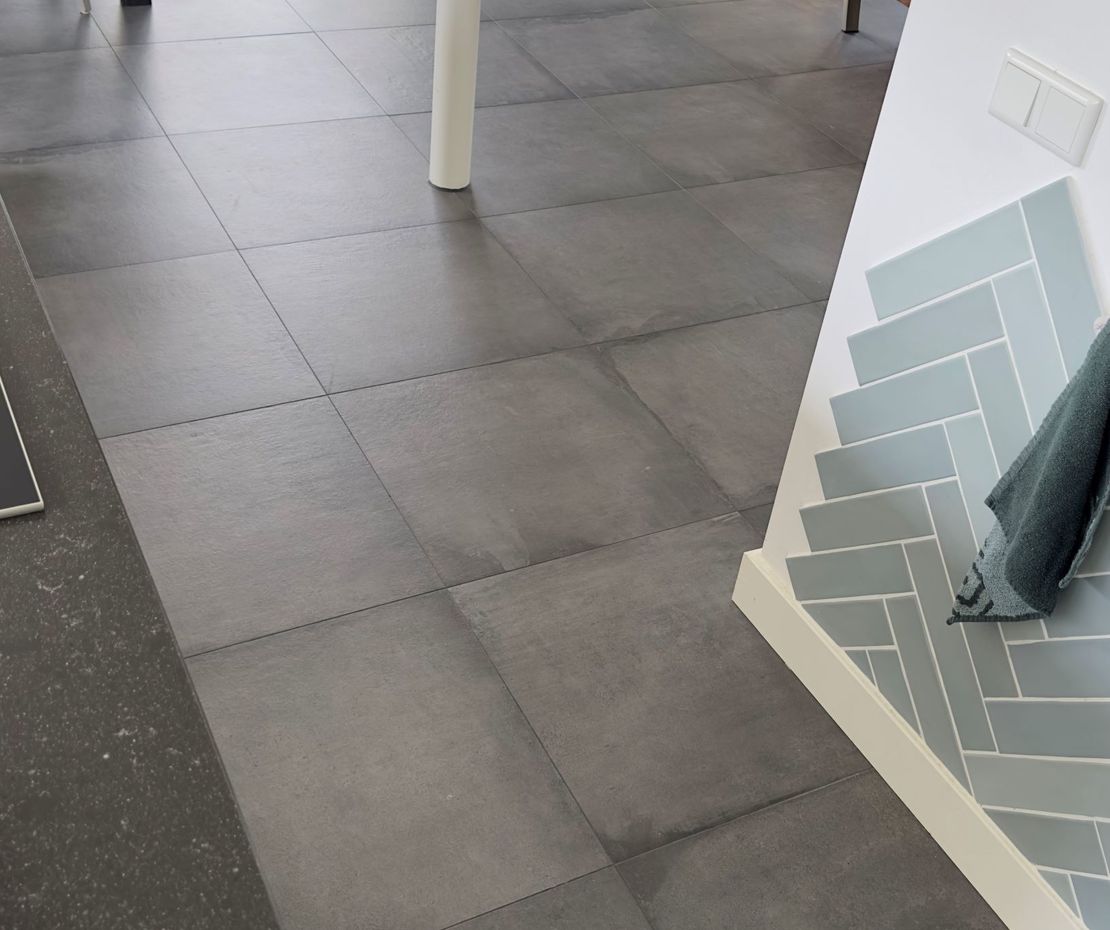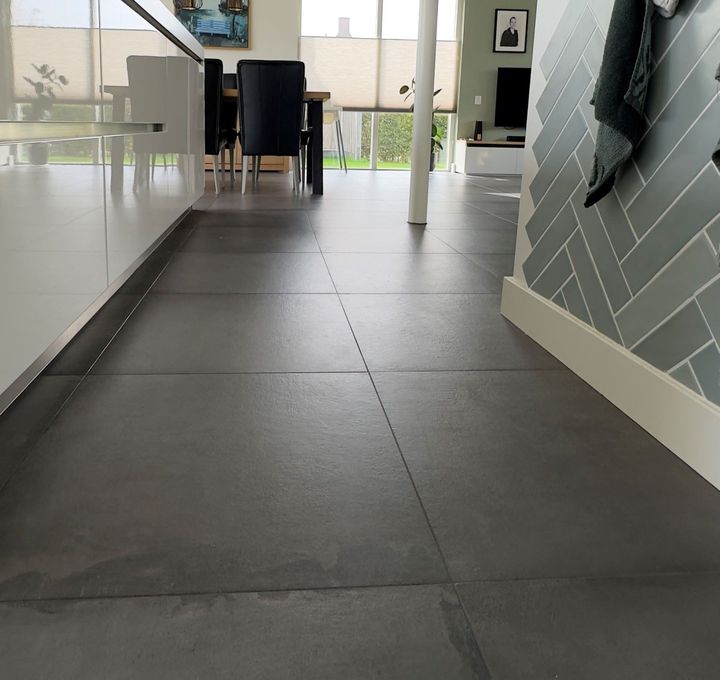 De 60x60cm betonlook tegelvloer in een stoere zwart/donkergrijze tint is een echte blikvanger in dit huis! De vloer is gelegd in de woonkamer, keuken en hal, waardoor er een mooi doorlopend effect ontstaat dat de ruimtes op een rustige manier met elkaar verbindt. De rustige betonlook geeft hier een strakke en tijdloze uitstraling.