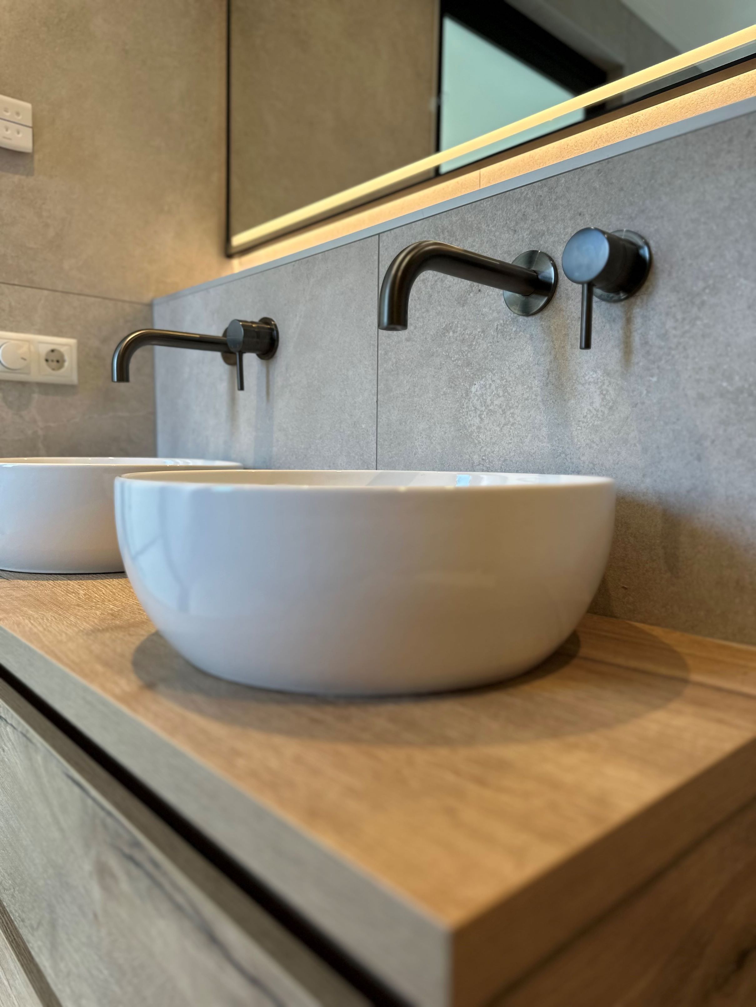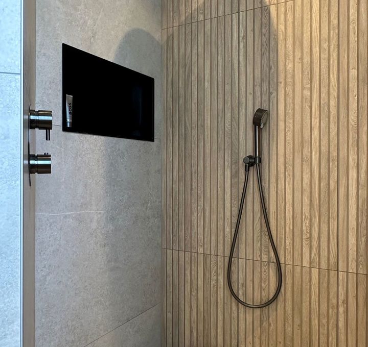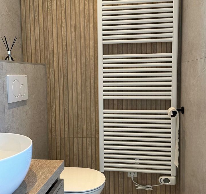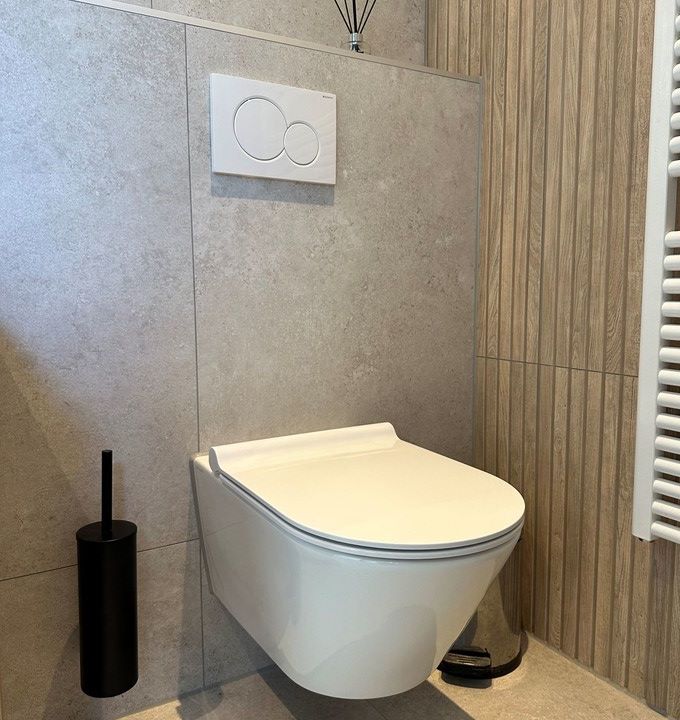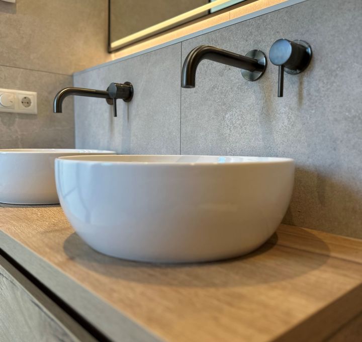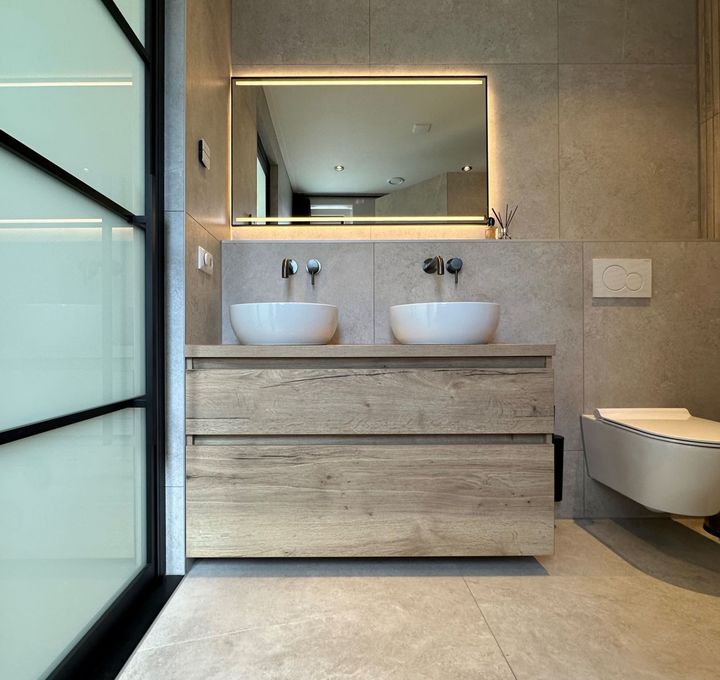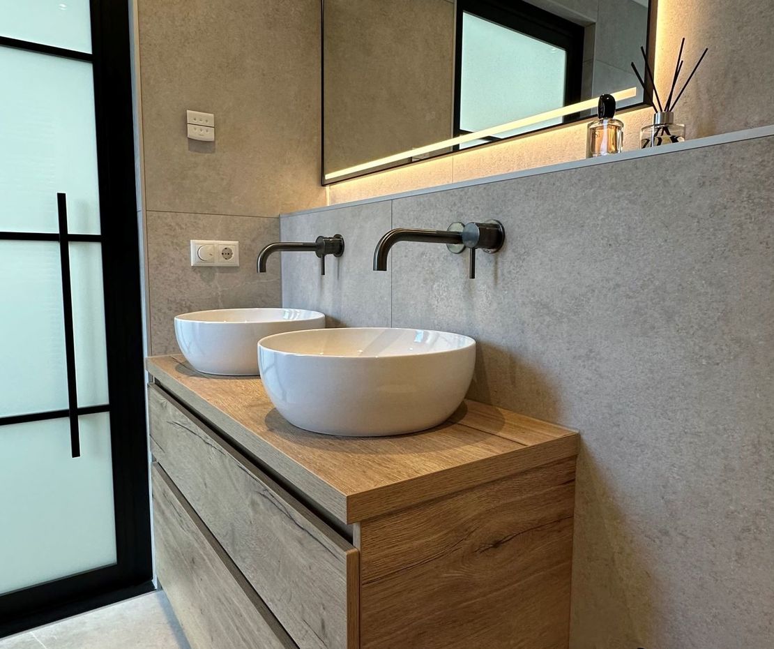 Een landelijke badkamer geleverd in Heerenveen combineert de rustieke charme van natuursteenlook met de warme uitstraling van houtlook. Deze harmonieuze mix van materialen creëert een sfeervolle en authentieke ambiance, ideaal voor een ontspannende en stijlvolle badkamerervaring.