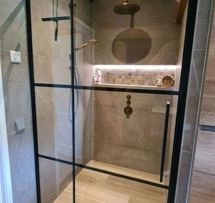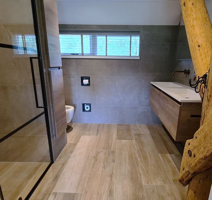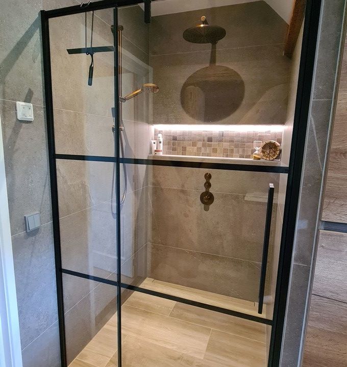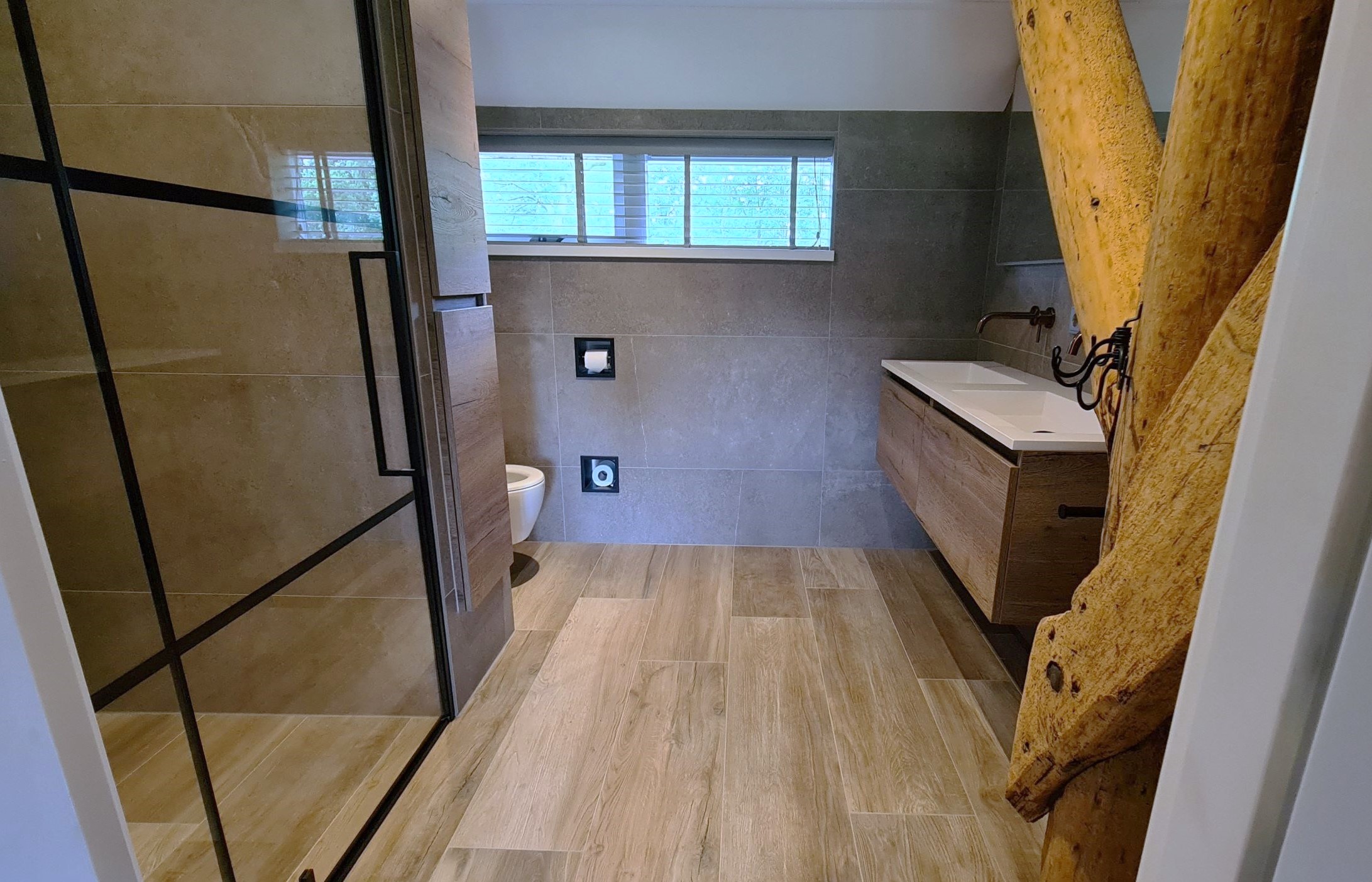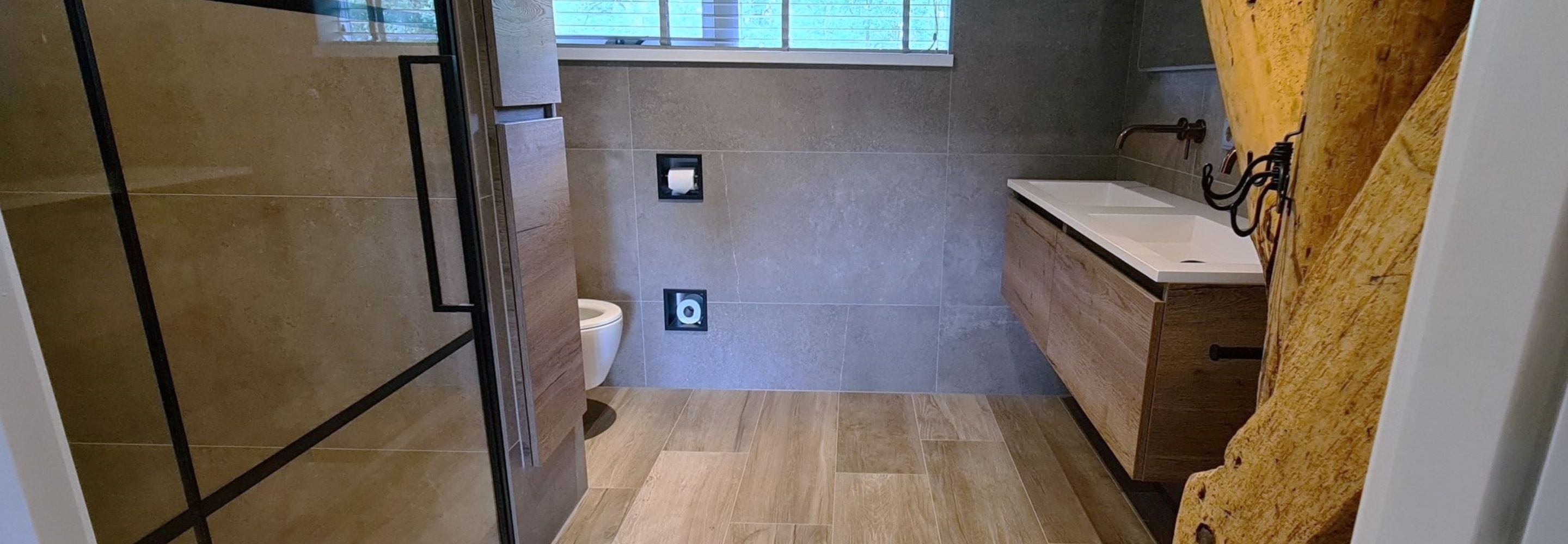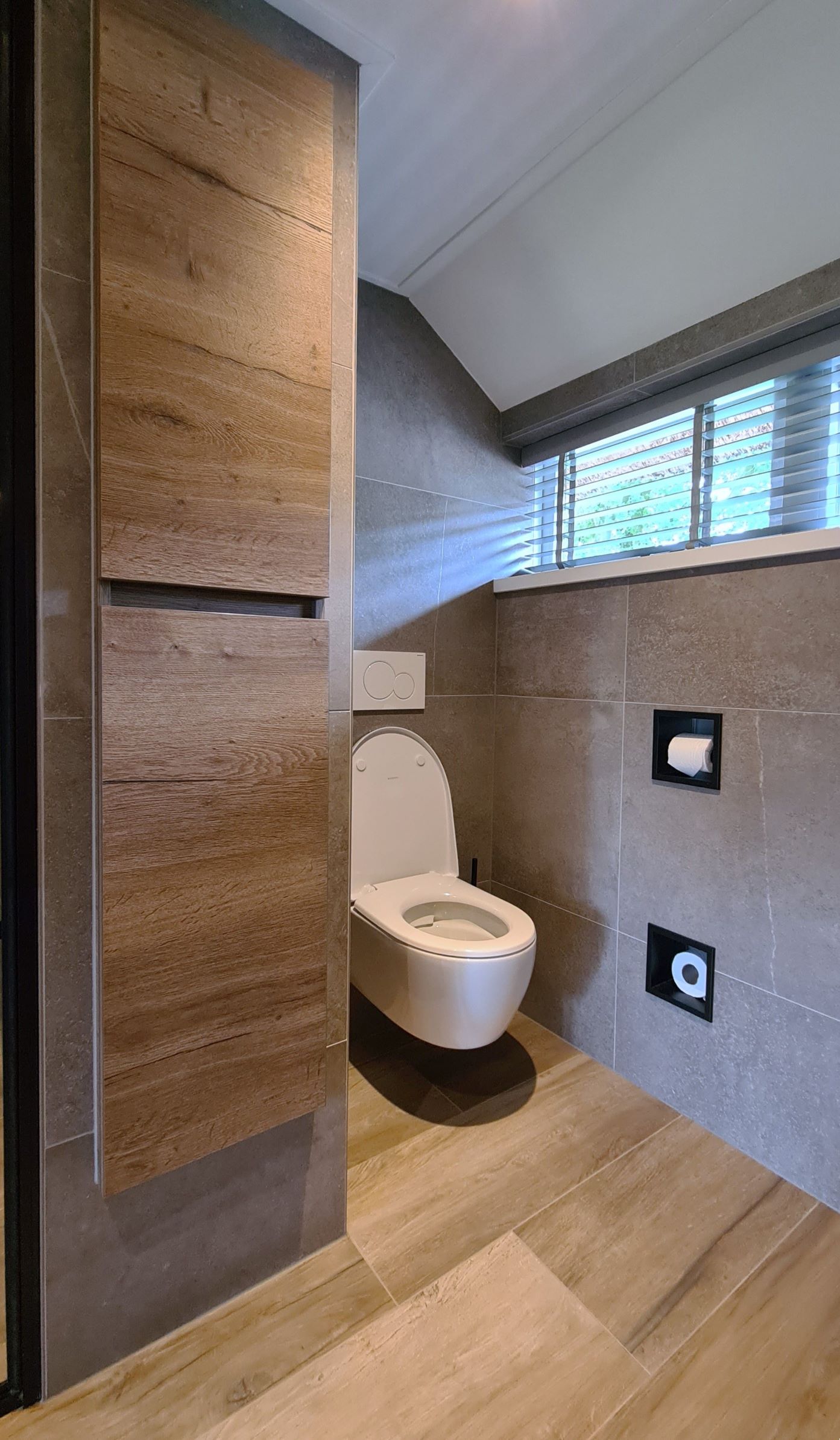 De ruimte is slim ingedeeld, met een hoge kast ingebouwd in de muur. Deze kast vormt de scheiding tussen het toilet en de douchehoek, waardoor de badkamer een open en georganiseerde uitstraling krijgt. De douche zelf heeft een strakke mat zwarte deur, wat een stoer contrast vormt met de rest van de badkamer.