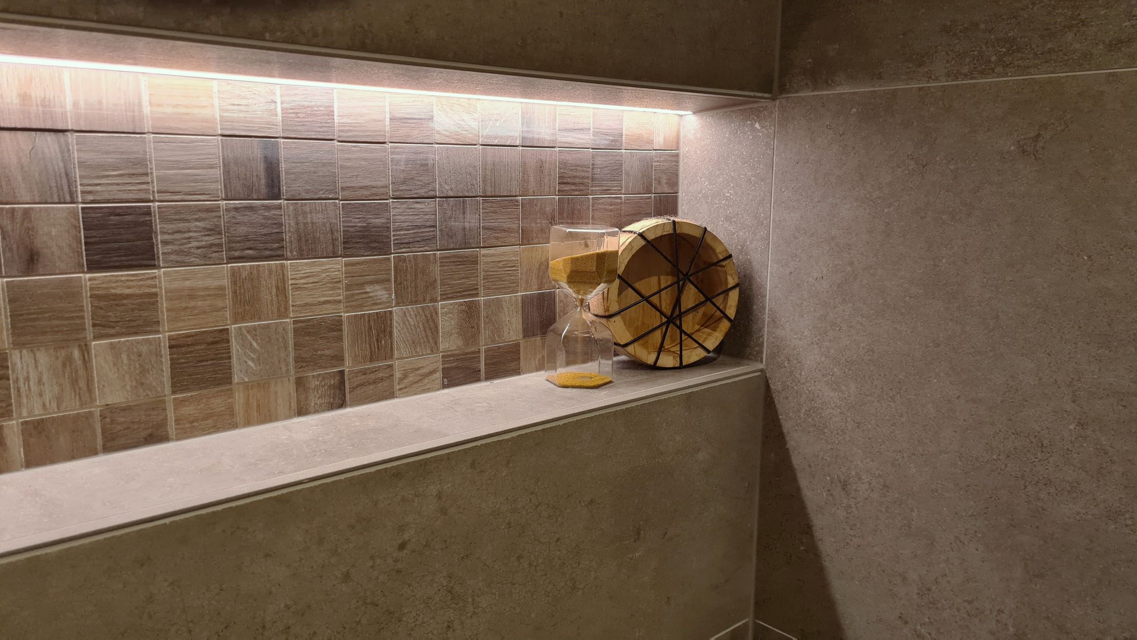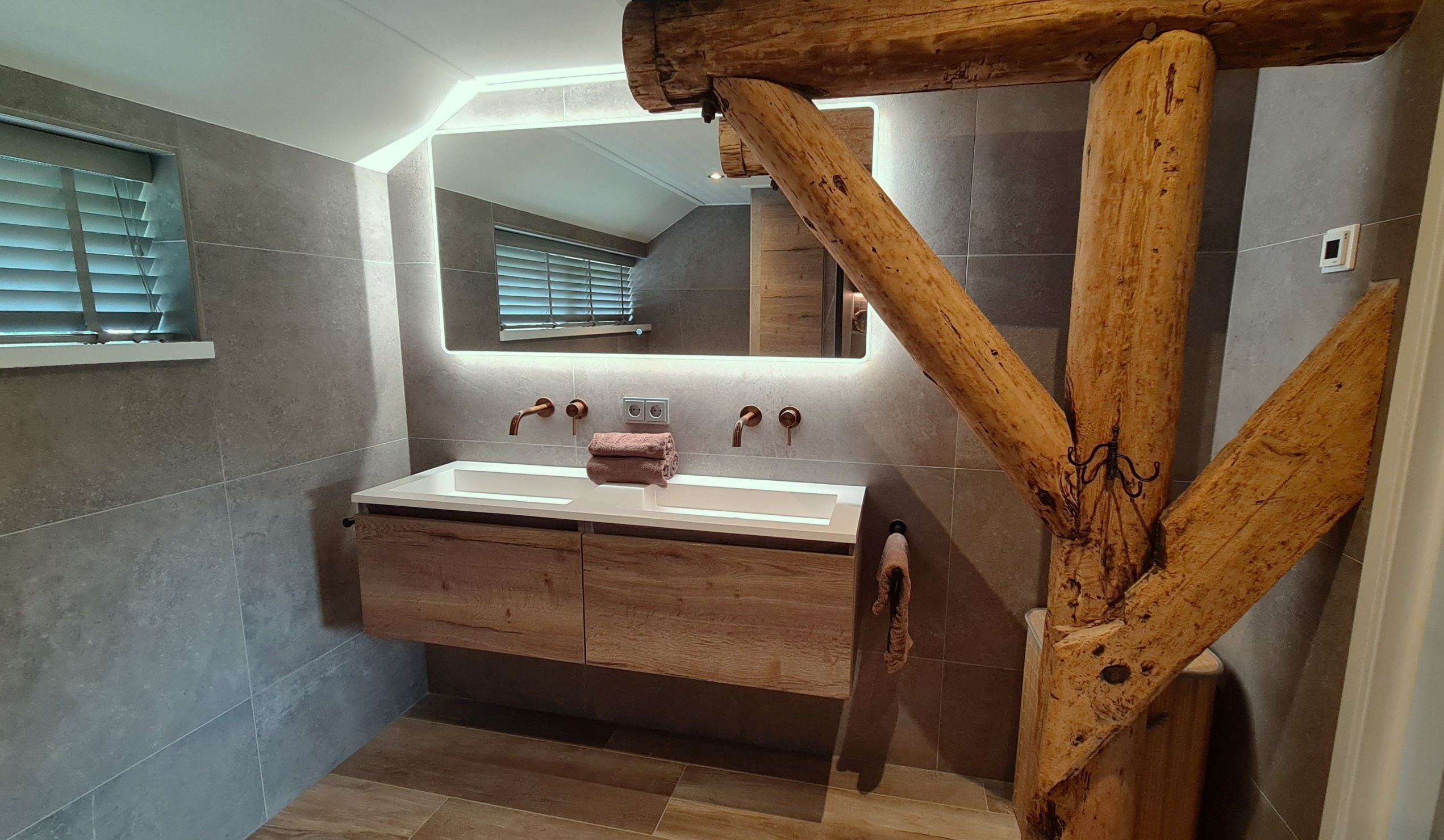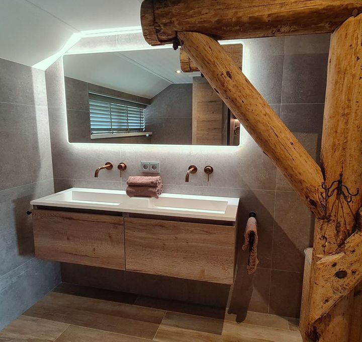 Stel je een badkamer voor die zowel stijlvol als praktisch is. Het middelpunt is een 140 cm breed badmeubel in de warme kleur Tabacco. Dit meubel heeft twee wastafels, perfect voor als je samen met iemand anders de badkamer gebruikt. De ingebouwde kranen boven de wastafels zijn van geborsteld koper en hebben een prachtig carving-detail, wat een luxe uitstraling geeft.