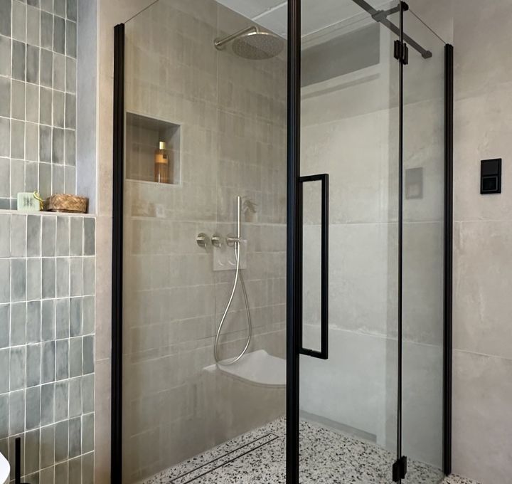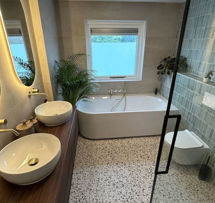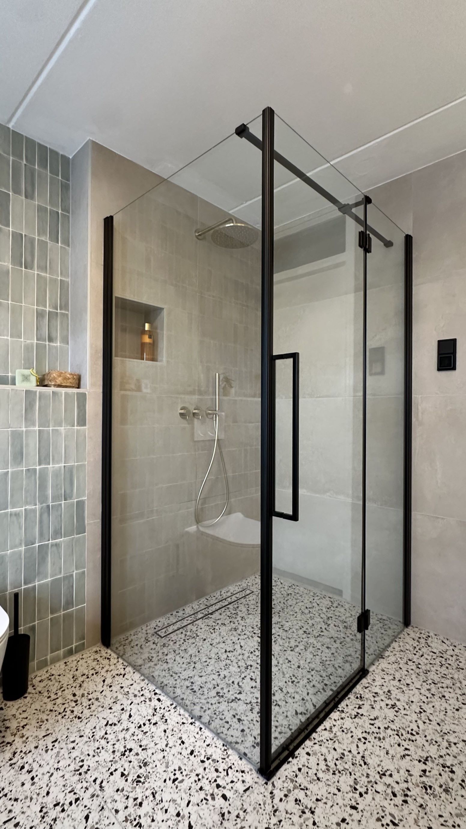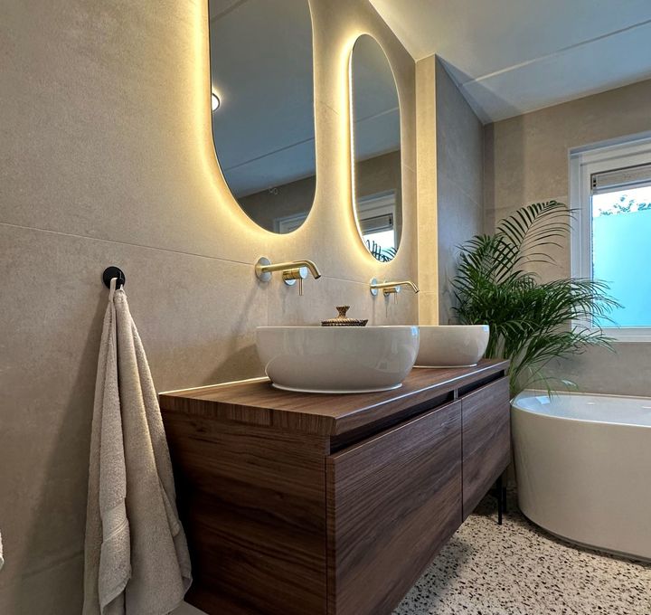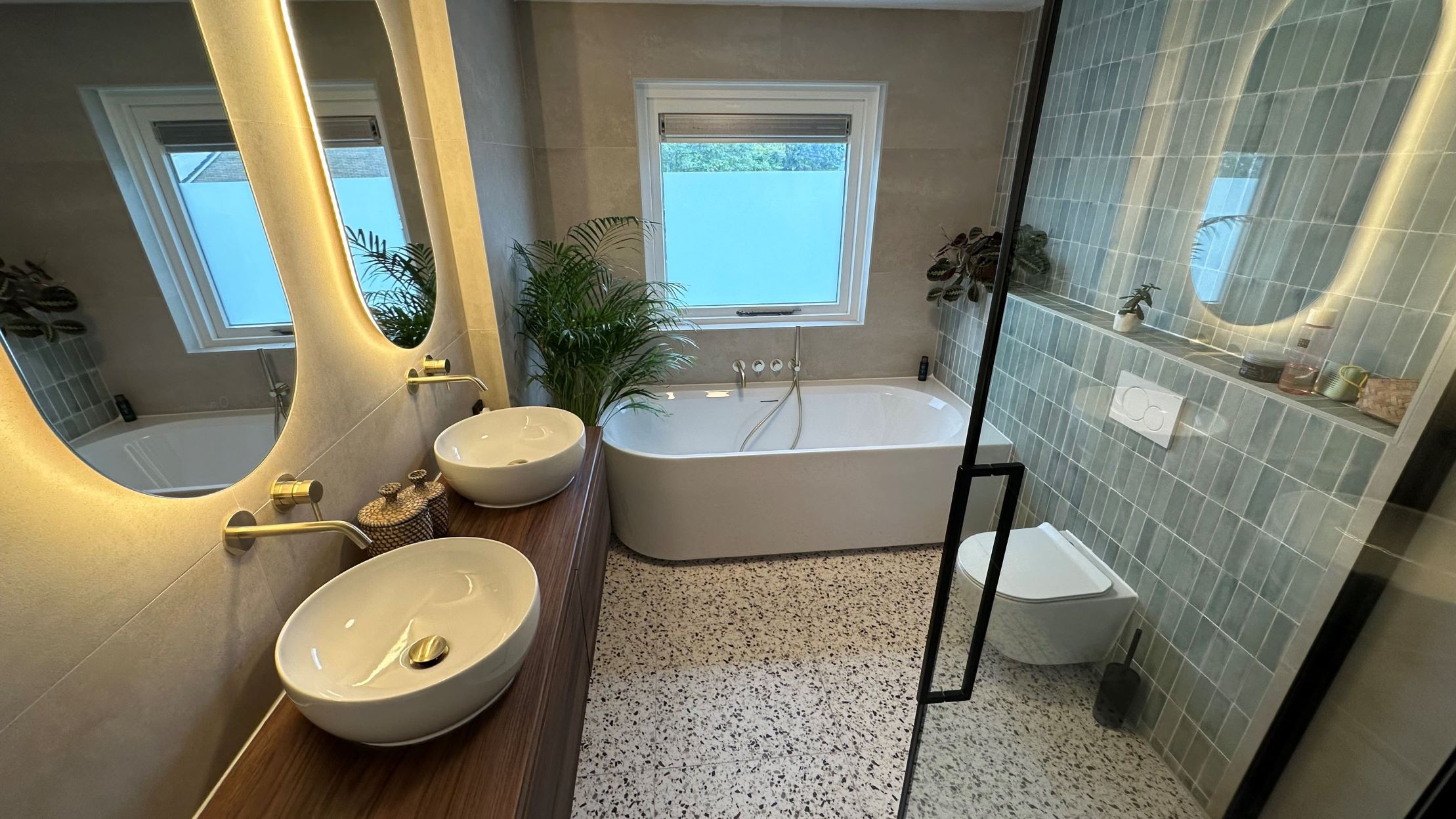 Deze retro, moderne badkamer is geleverd in Sneek, met een verfijnde combinatie van beige en groentinten. De nieuwe inrichting biedt een frisse en ontspannen sfeer, perfect voor dagelijks gebruik. Het strakke retro design en de harmonieuze kleuren zorgen voor een luxe uitstraling en een rustige ambiance. Een ideale upgrade voor elke moderne woning.