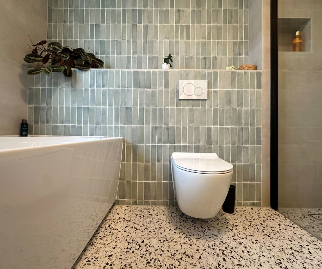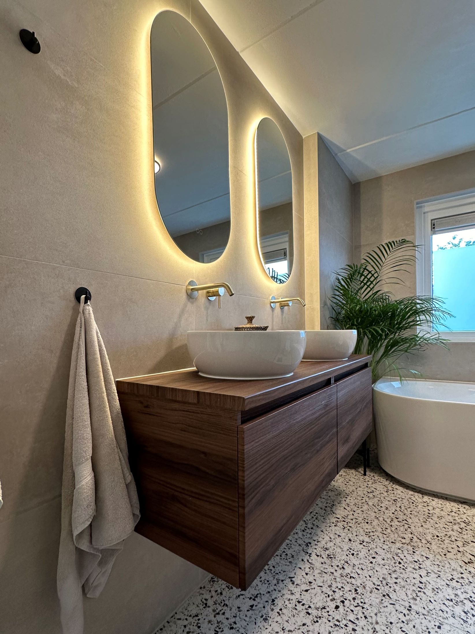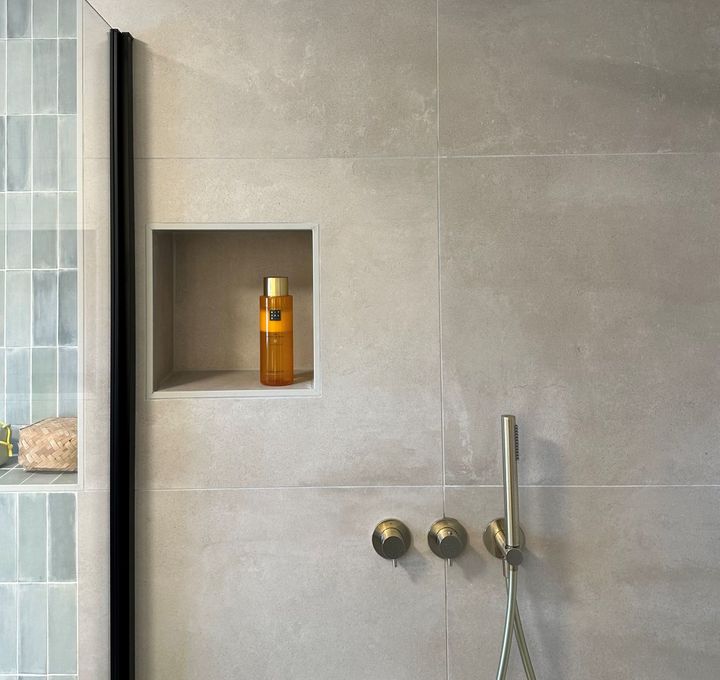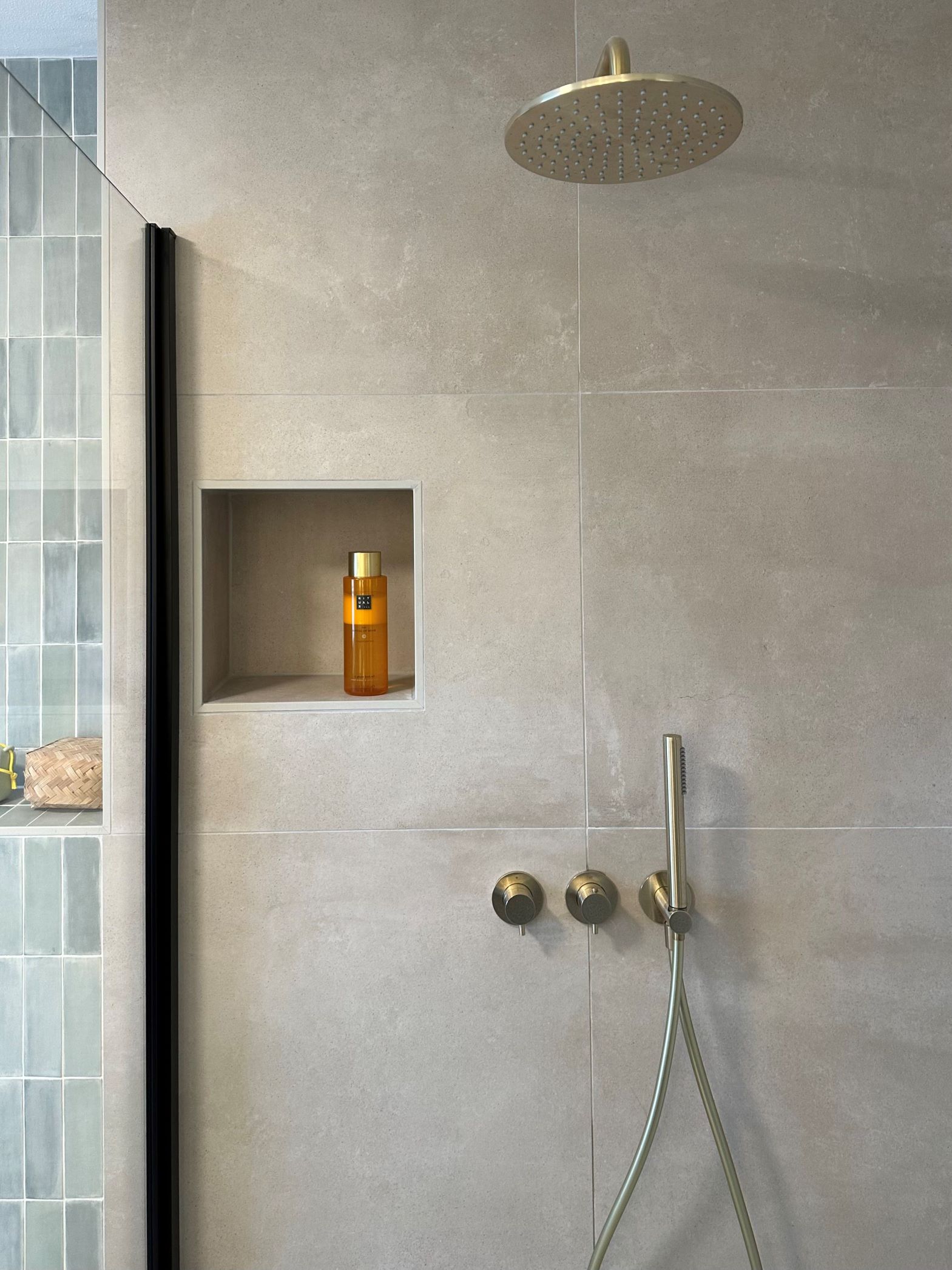 Deze retro, moderne badkamer is geleverd in Sneek, met een verfijnde combinatie van beige en groentinten. De nieuwe inrichting biedt een frisse en ontspannen sfeer, perfect voor dagelijks gebruik. Het strakke retro design en de harmonieuze kleuren zorgen voor een luxe uitstraling en een rustige ambiance. Een ideale upgrade voor elke moderne woning.