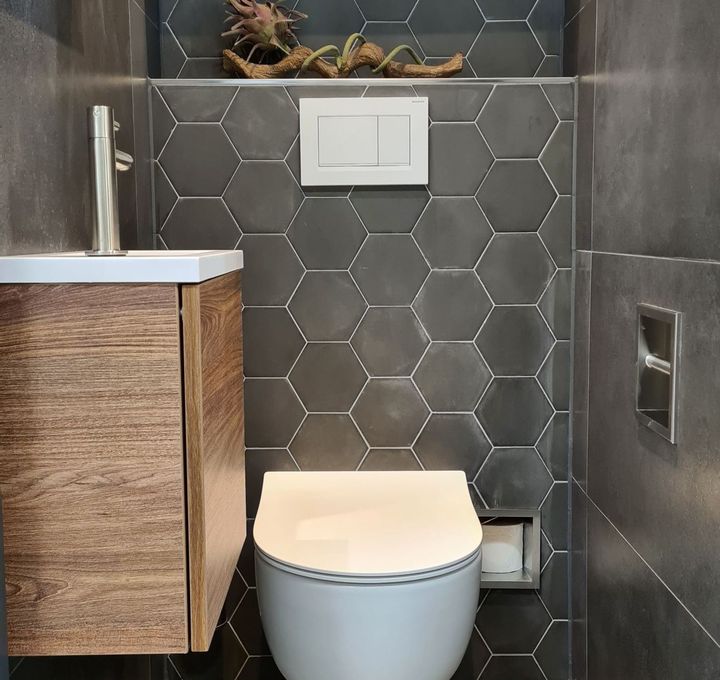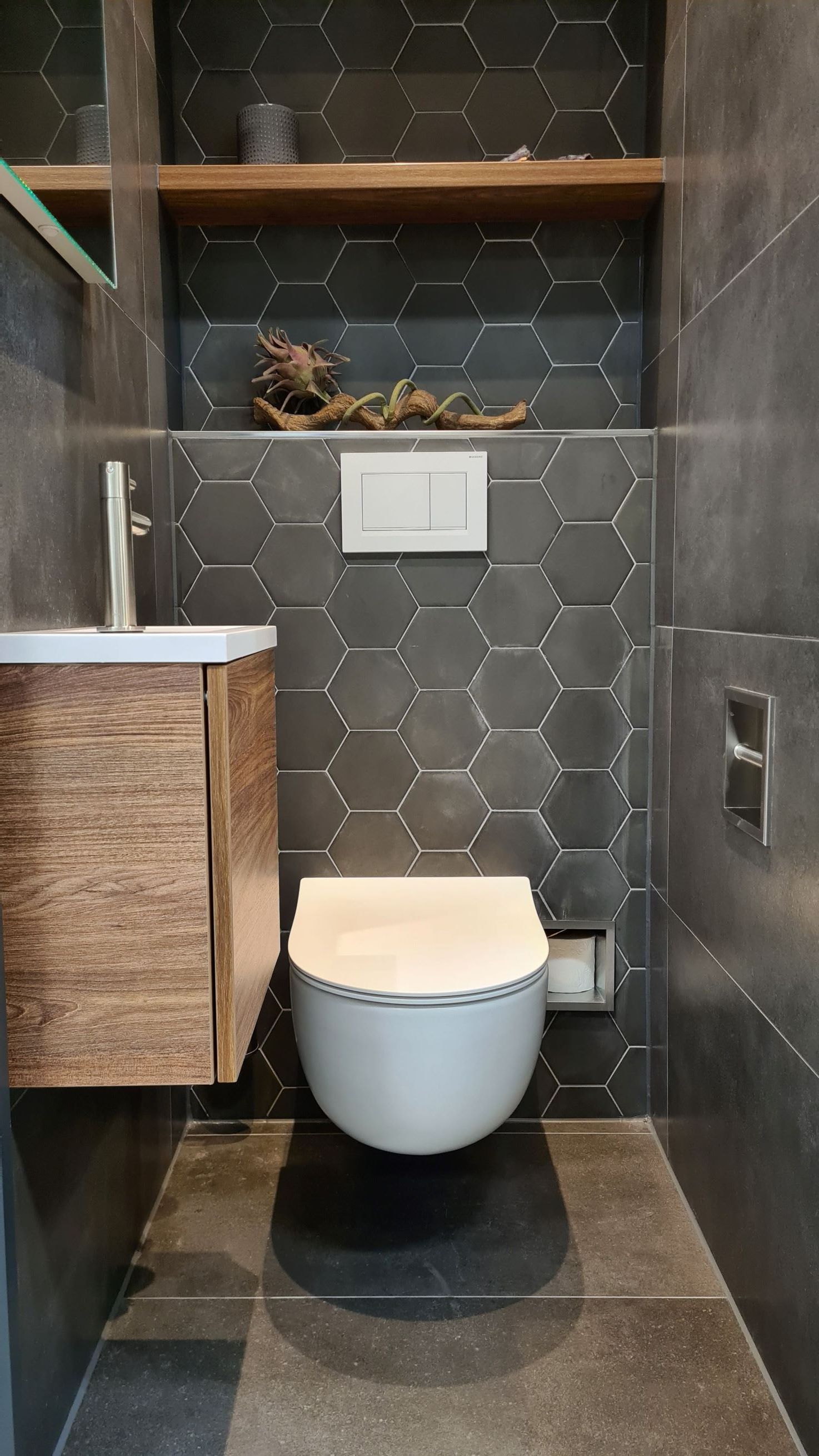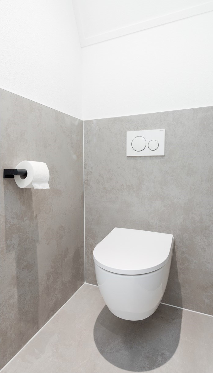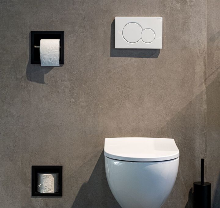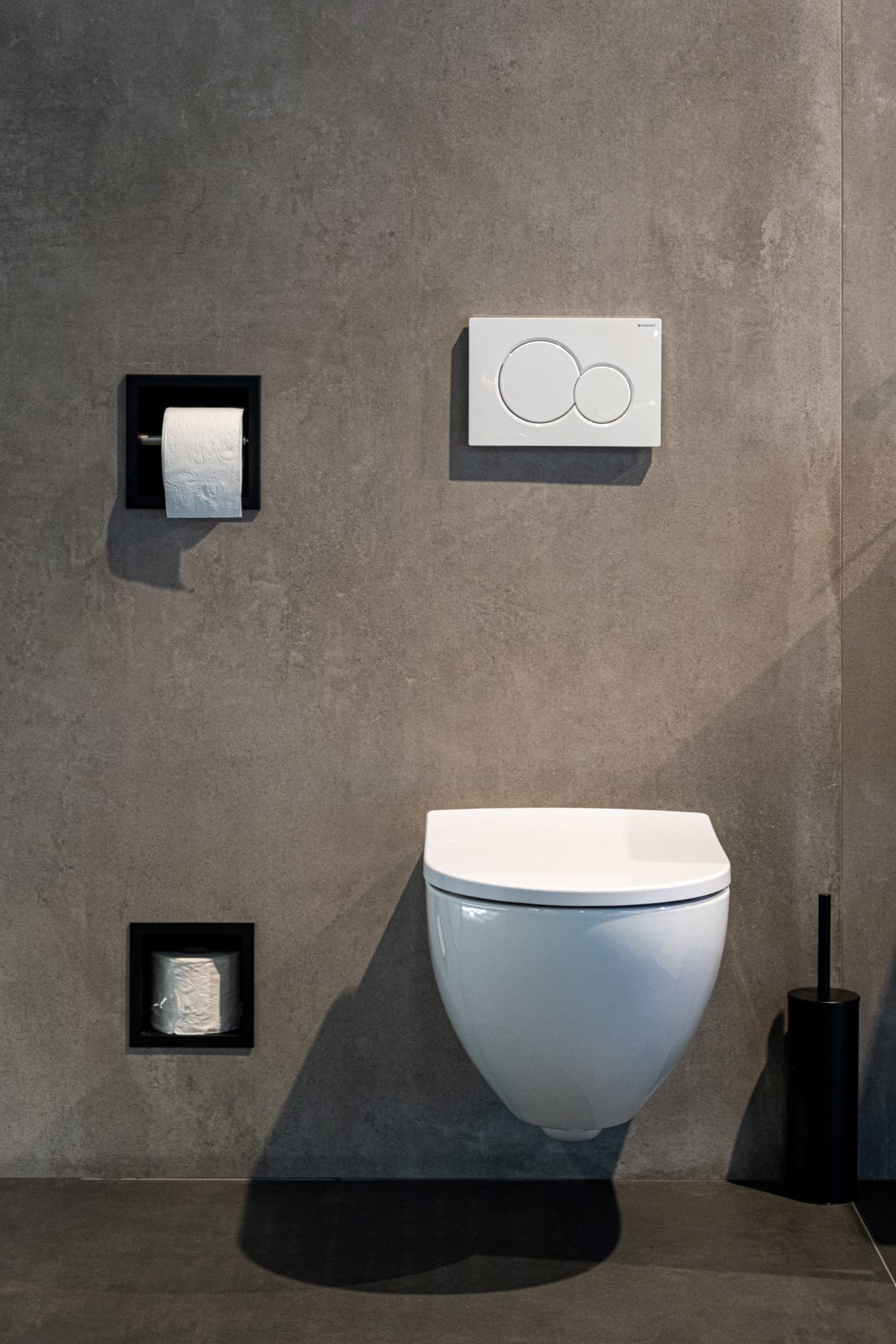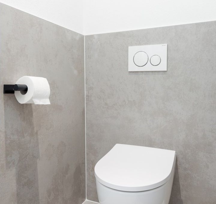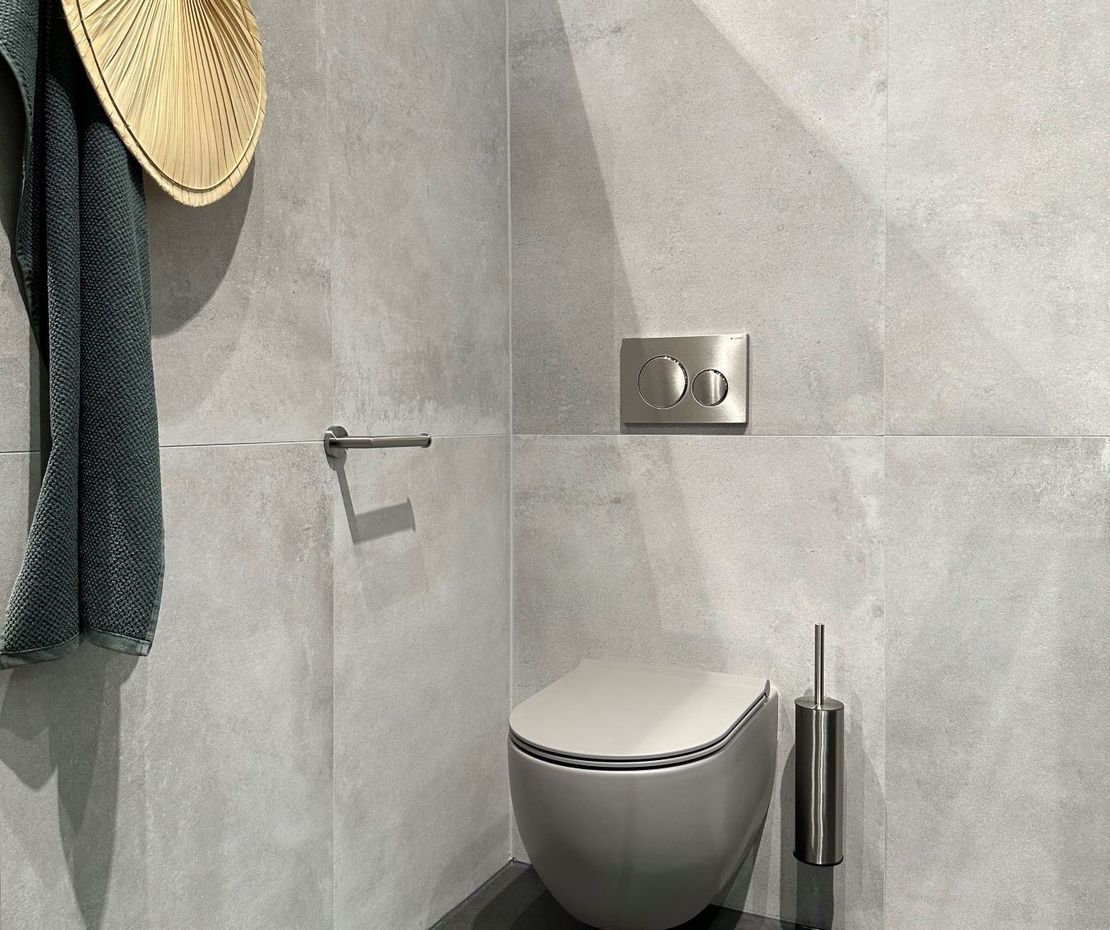 In moderne toiletten zie je veel dezelfde materialen terugkomen, zoals strakke tegels en minimalistische afwerkingen. De betonlook past daar perfect bij omdat het zowel stijlvol als functioneel is, en het geeft een frisse, hedendaagse twist aan elke ruimte.