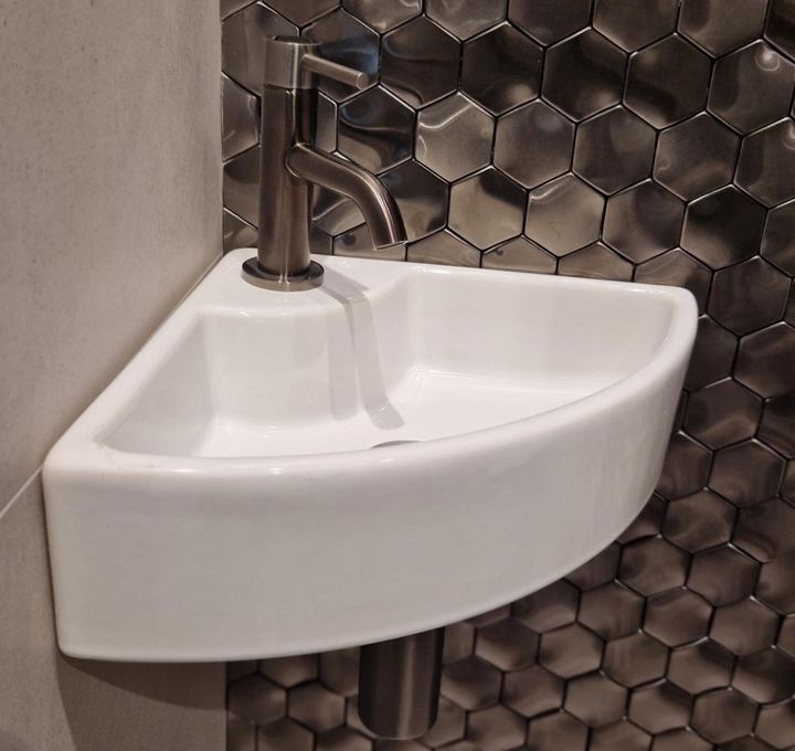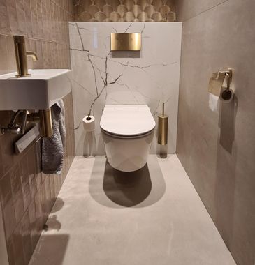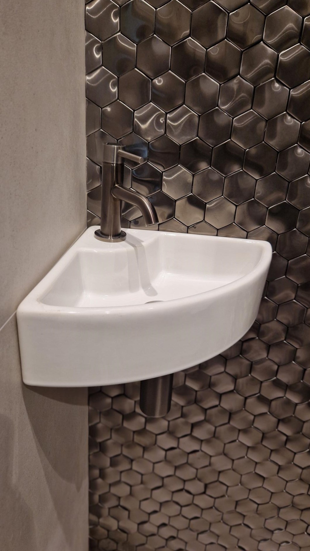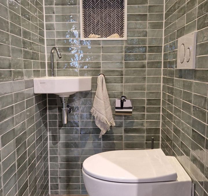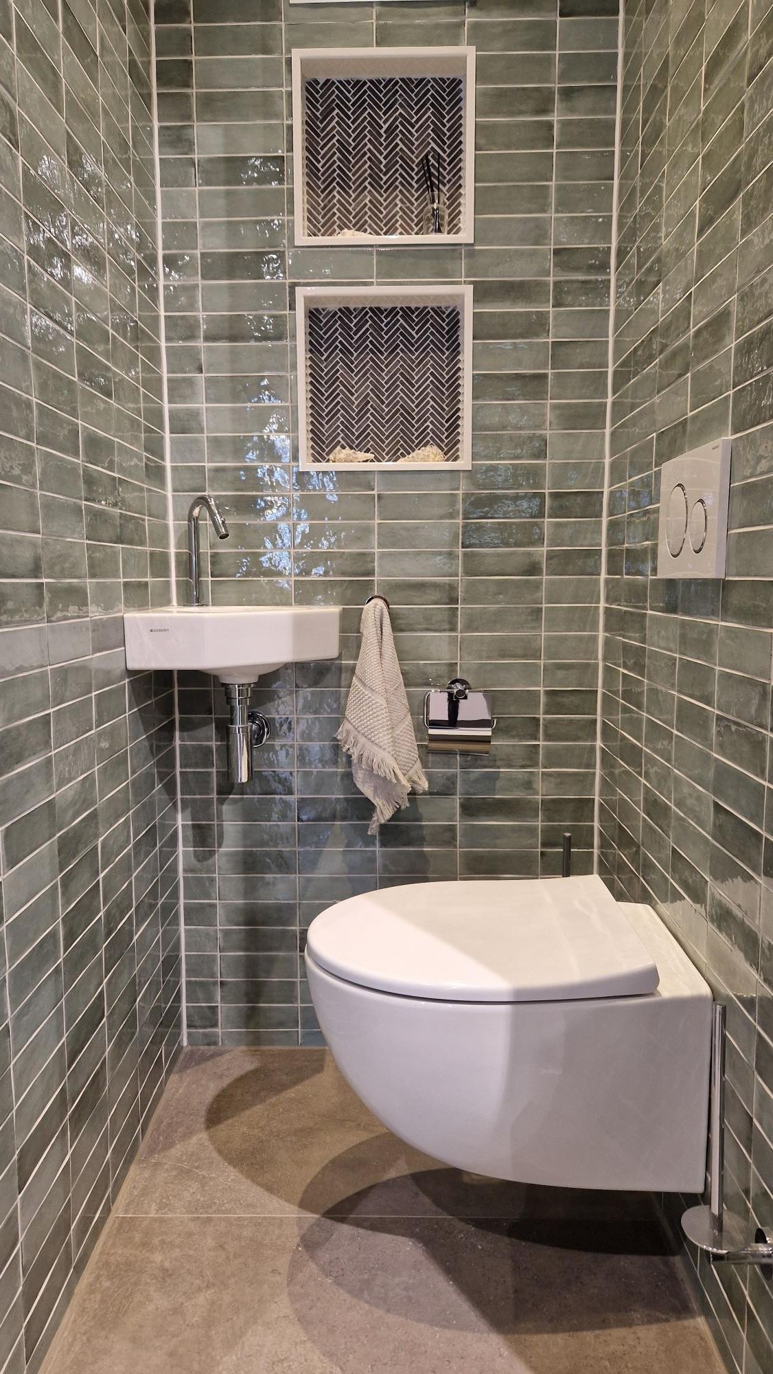 Het kleine toilet heeft een knusse, maar functionele sfeer. Het is compact en eenvoudig, met een klein fonteintje. Ondanks de beperkte ruimte is het goed verzorgd en schoon.