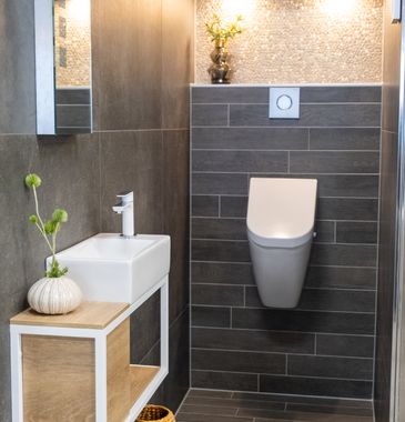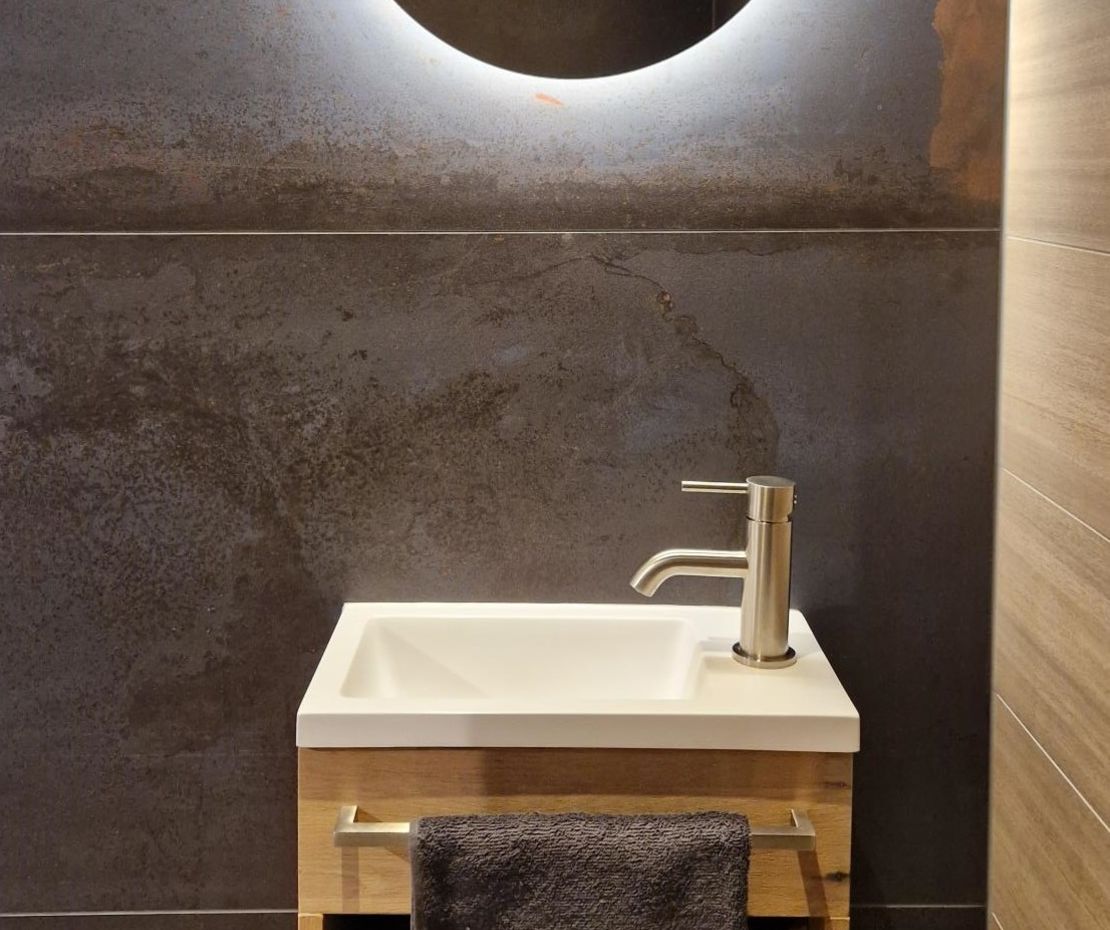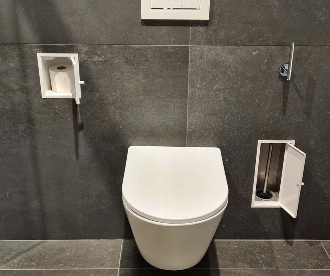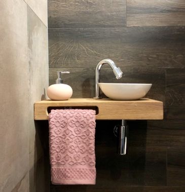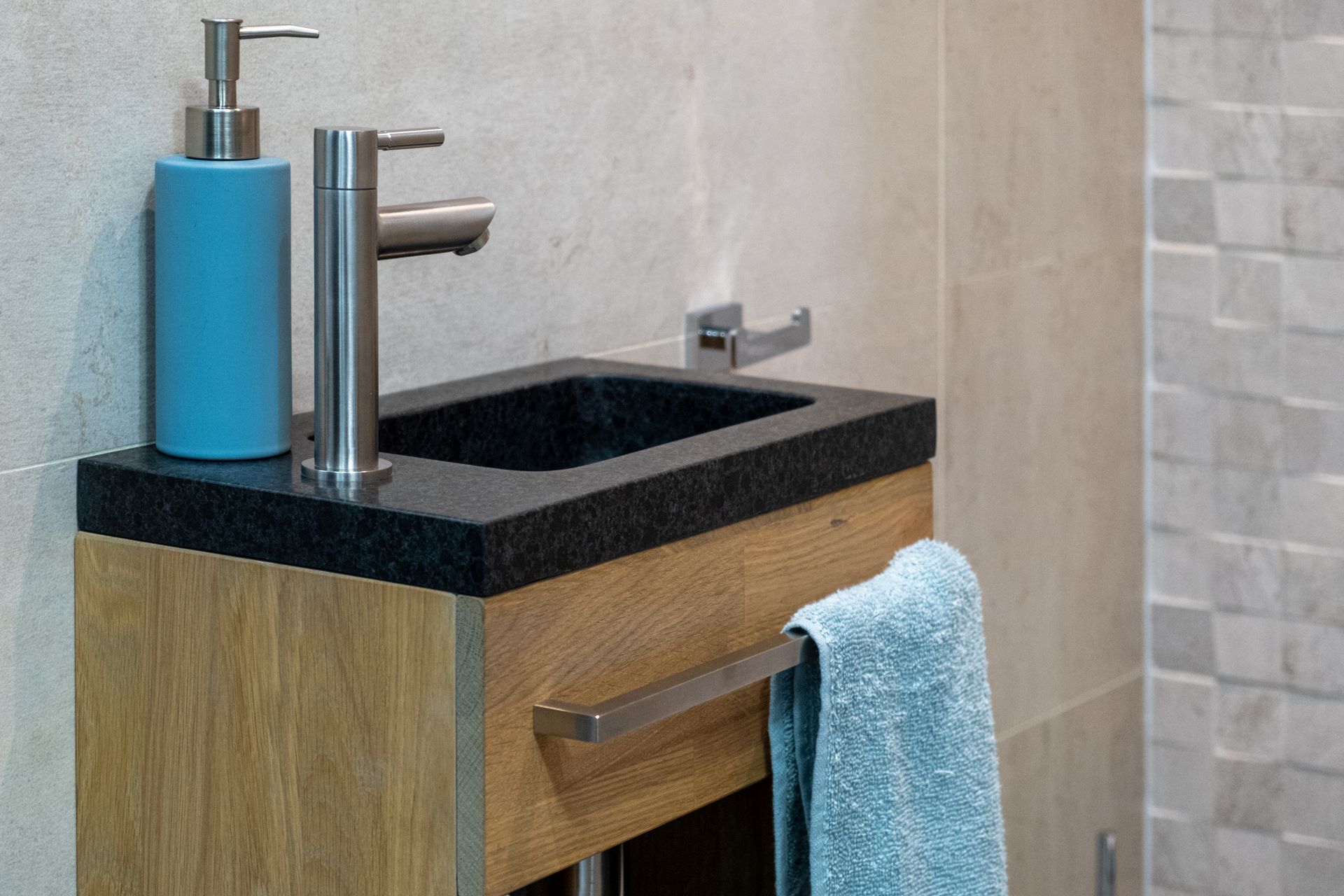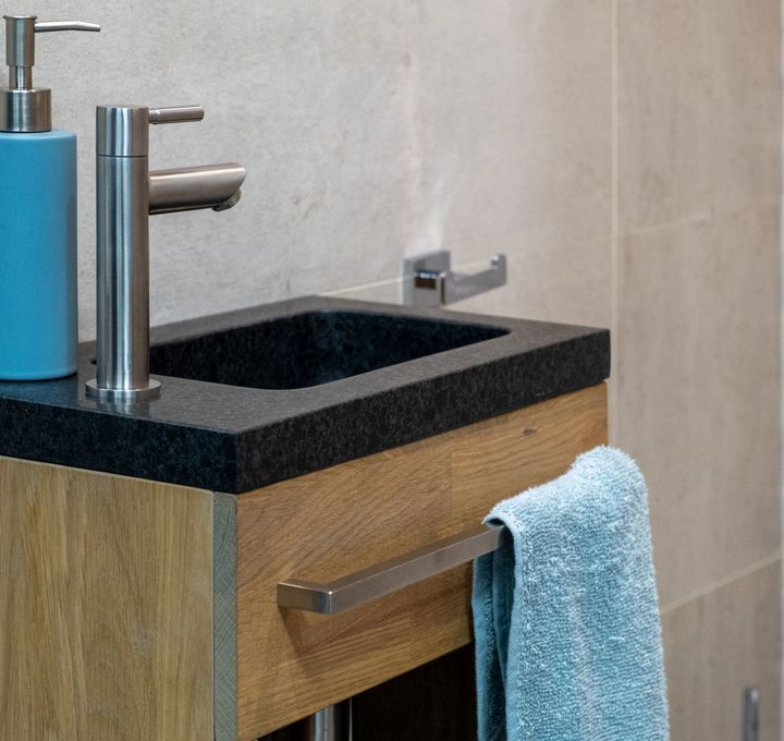 Het heeft een gezellige uitstraling door de slimme opbergoplossingen en misschien een klein plantje of een leuke handdoek om het wat persoonlijker te maken.